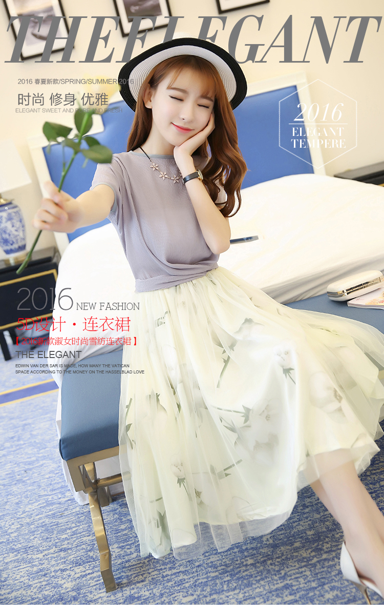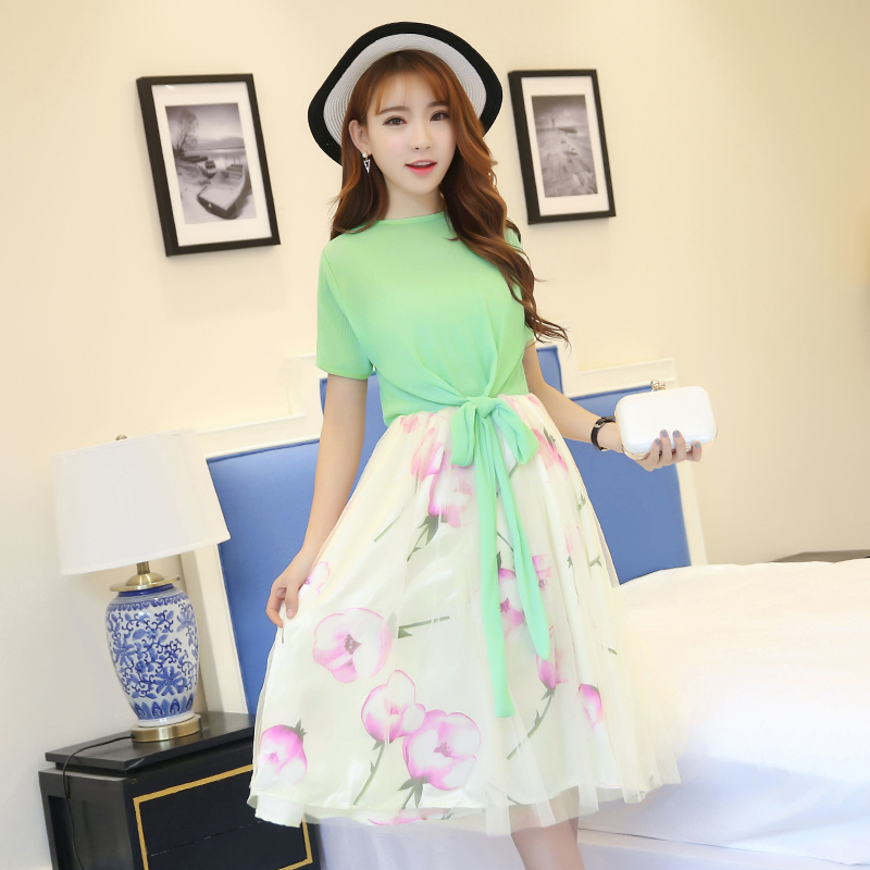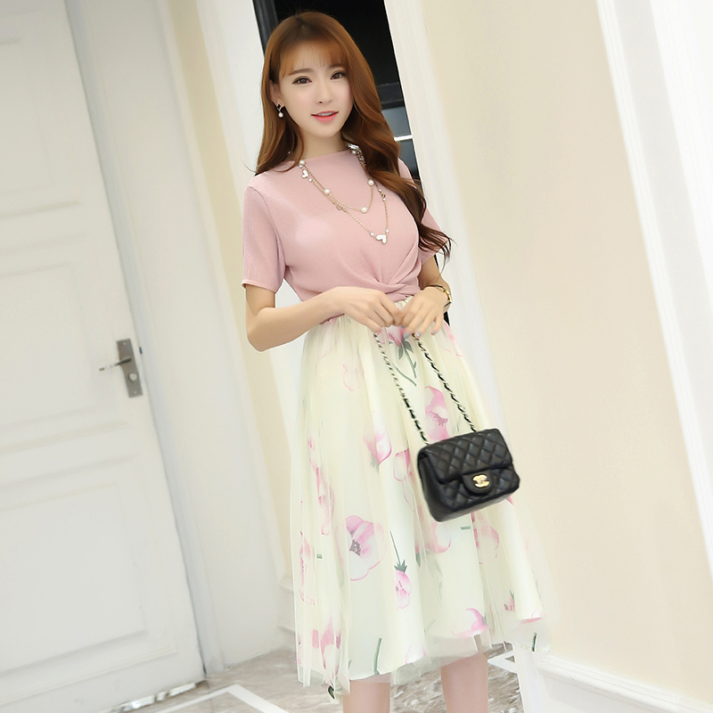 春夏新款韓版女收腰短裙套裝印花T恤網紗半身裙兩件套連衣裙