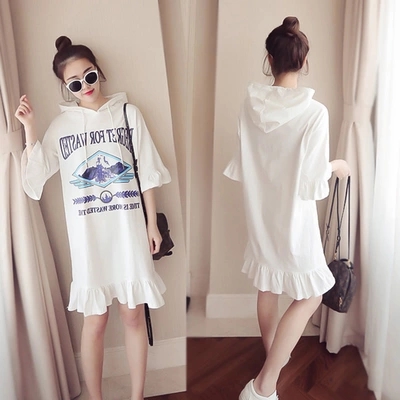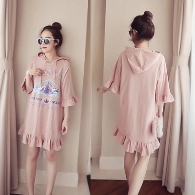 夏裝軟妹字母休閑連帽七分袖寬松荷葉邊連衣裙女中長款學生打底裙