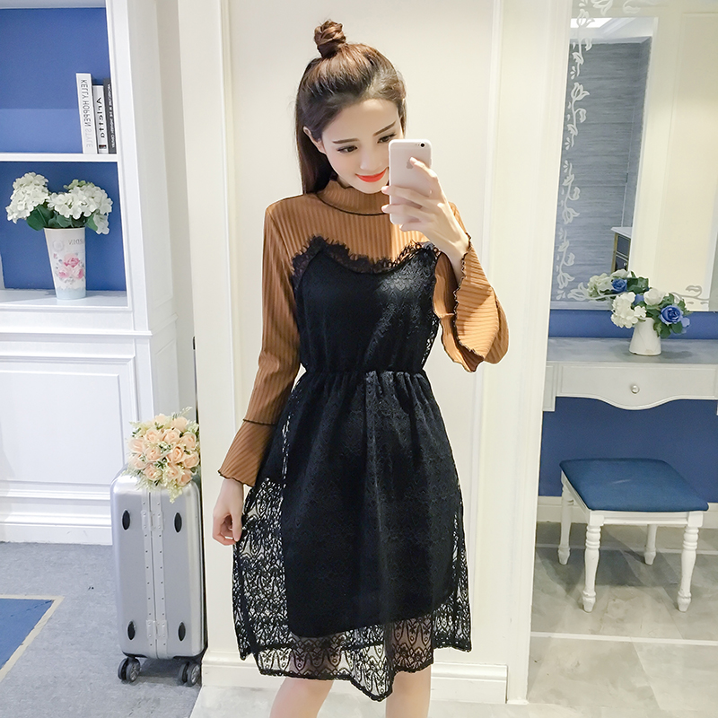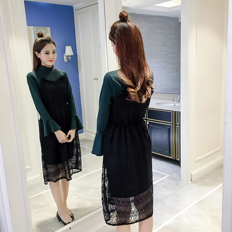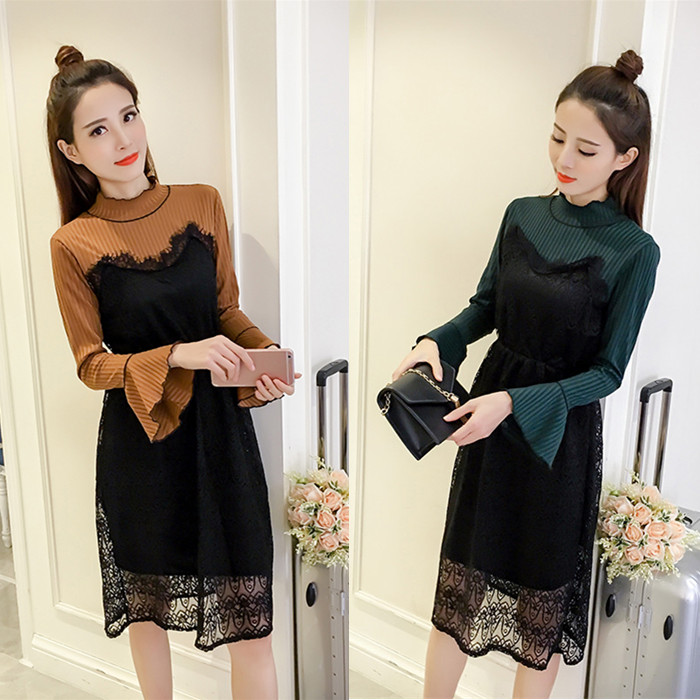 春裝新款女裝韓版中長款蕾絲拼接打底裙收腰顯瘦喇叭袖連衣裙