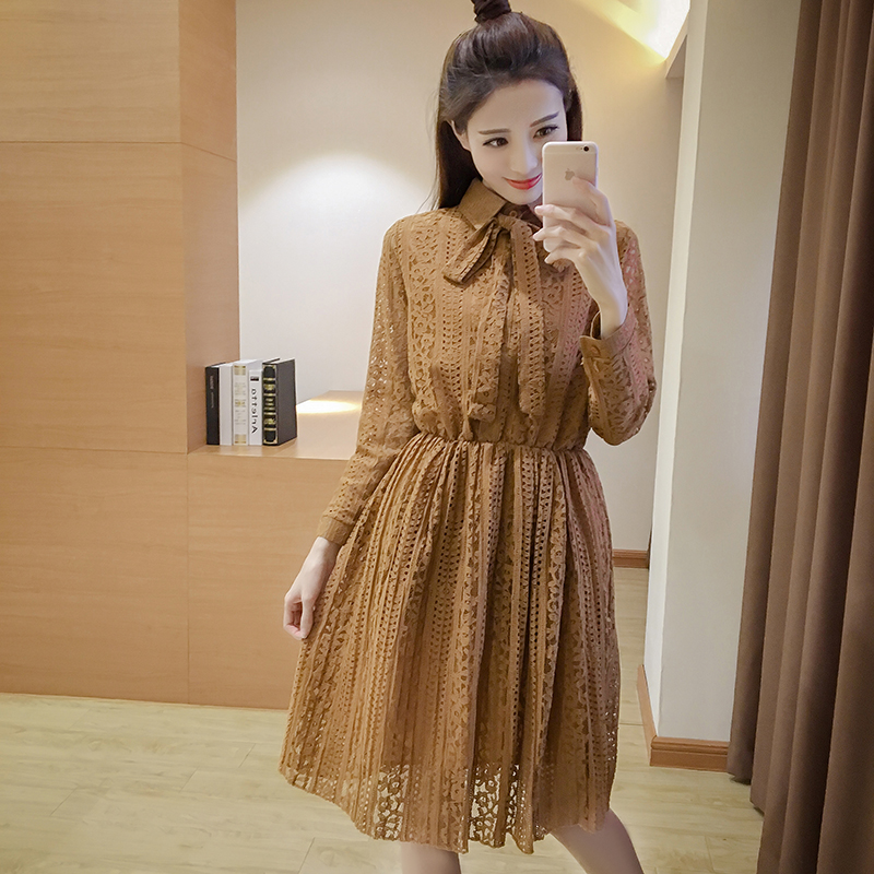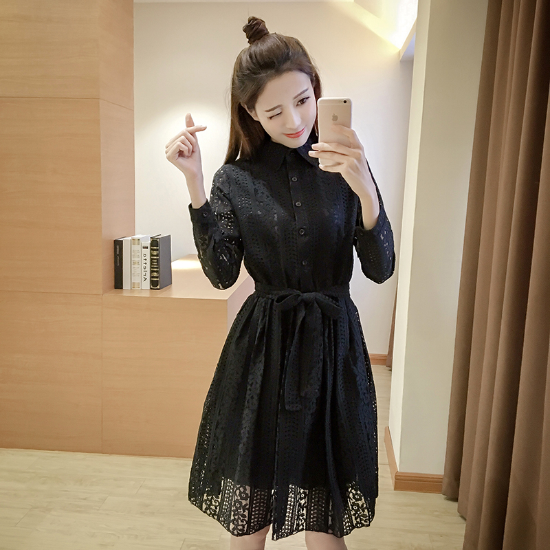 春新款女裝韓版中長款蕾絲打底裙修身收腰長袖襯衫連衣裙春秋
