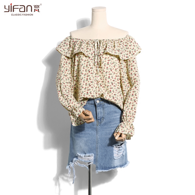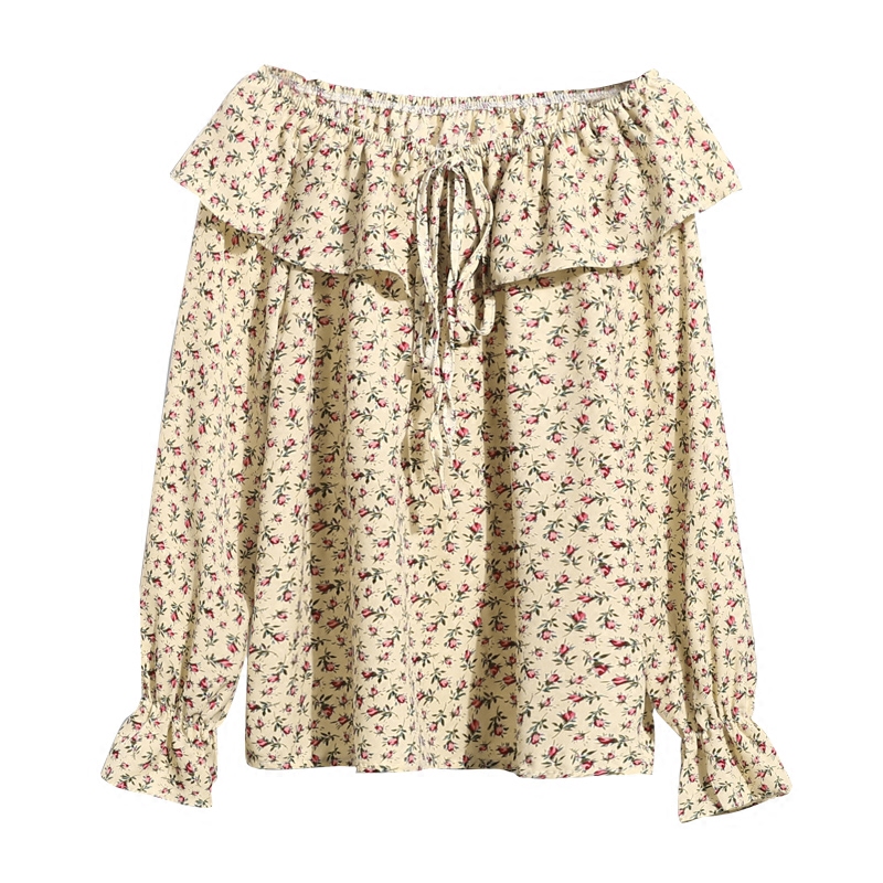 春夏季新款韓版碎花雪紡衫長袖一字肩喇叭袖印花露肩雪紡上衣