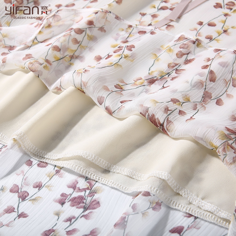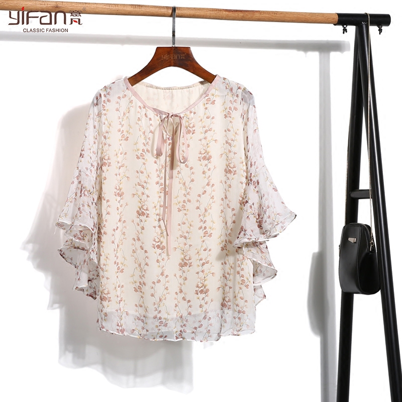 喇叭袖雪紡上衣女夏季新款韓版甜美七分袖系帶荷葉邊碎花小衫