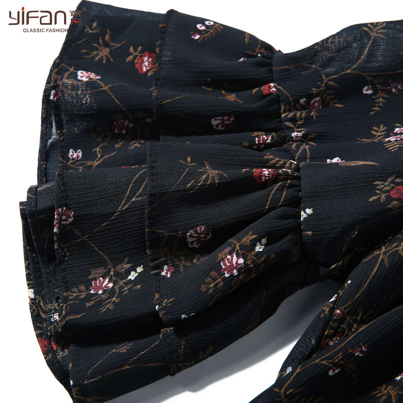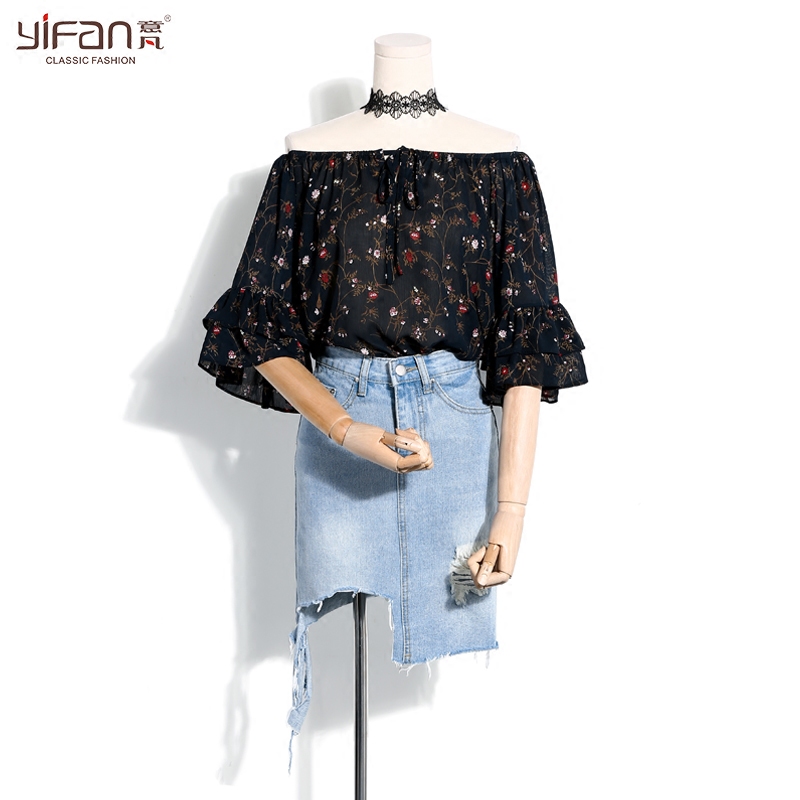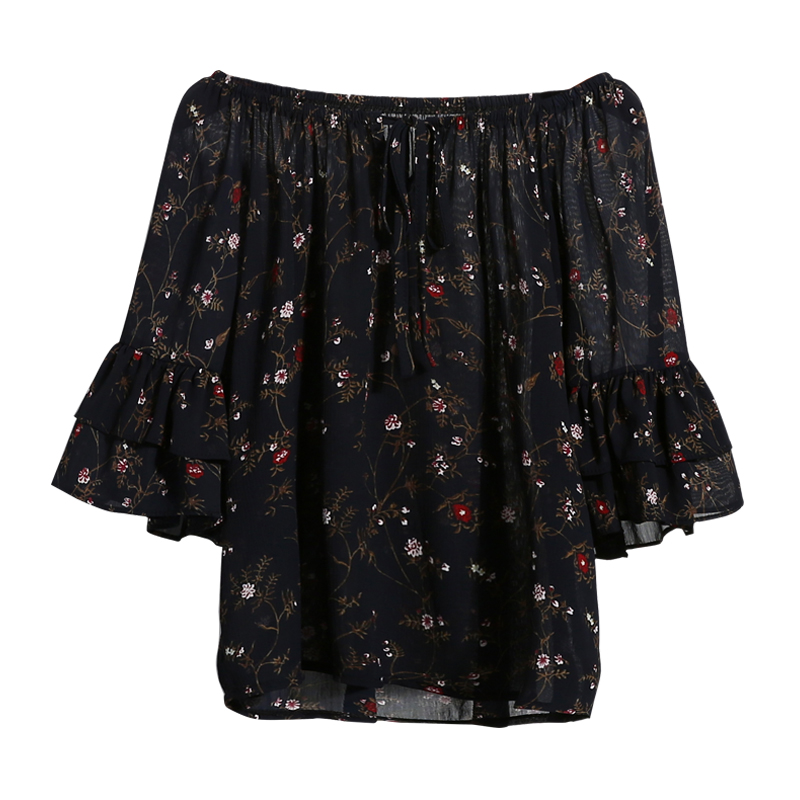 夏季新款一字領露肩荷葉邊印花雪紡衫女蝴蝶結喇叭袖碎花上衣