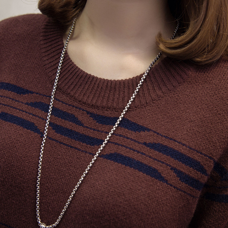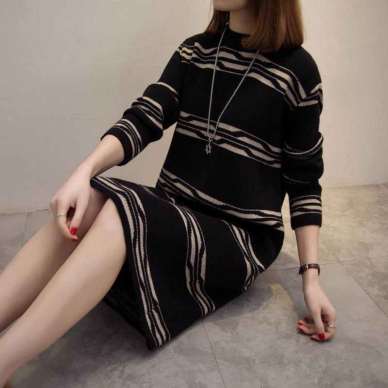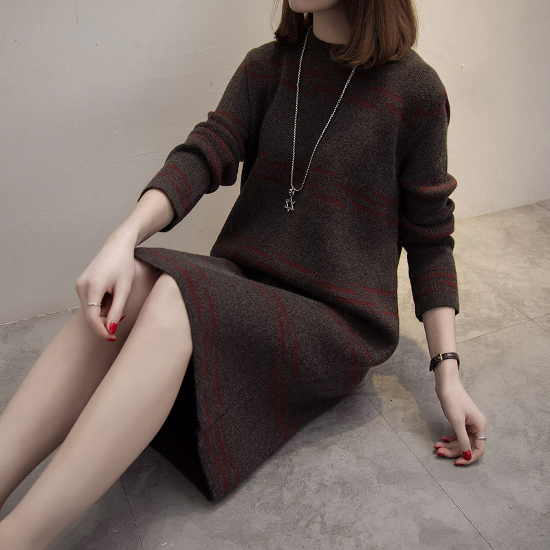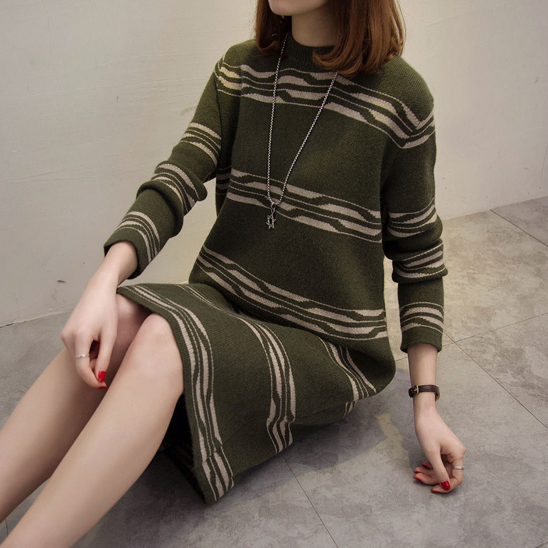 中長款套頭圓領韓版寬松拼色針織秋冬季打底衫女毛衣裙外套毛線衣