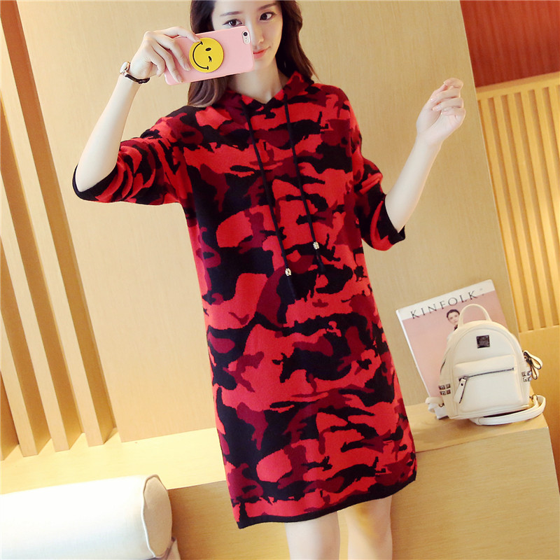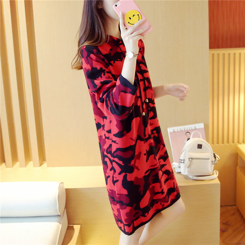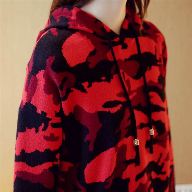女裝冬裝新款潮迷彩針織衫套頭連帽外套毛衣女秋冬上衣中長款