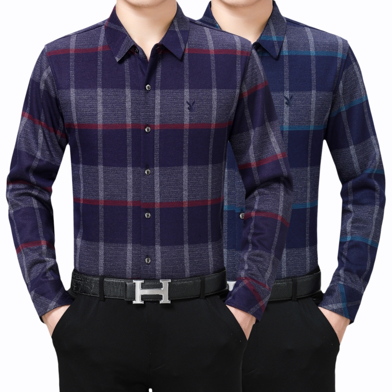 花花公子正品中年男士長袖加絨加厚襯衫商務男裝格子保暖羊絨襯衣