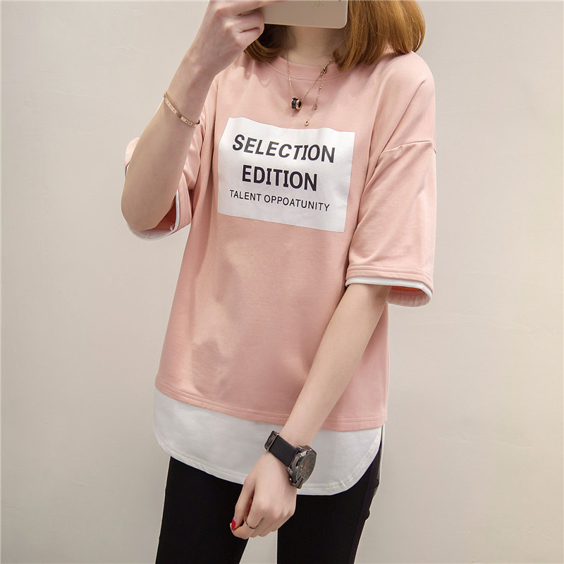 短袖t恤女上衣寬松韓版體恤假兩件中長款體恤夏裝新款女衣服