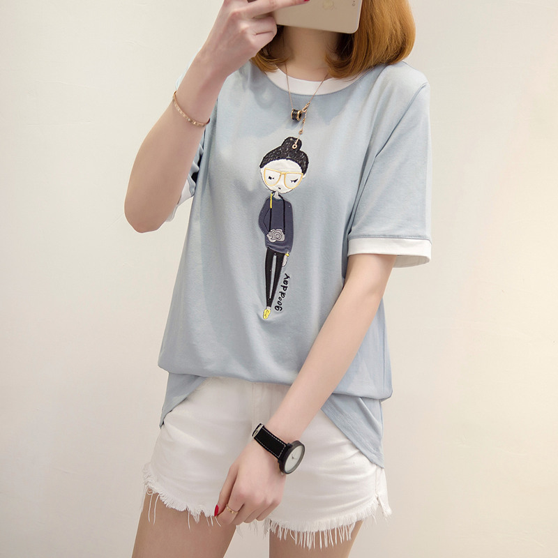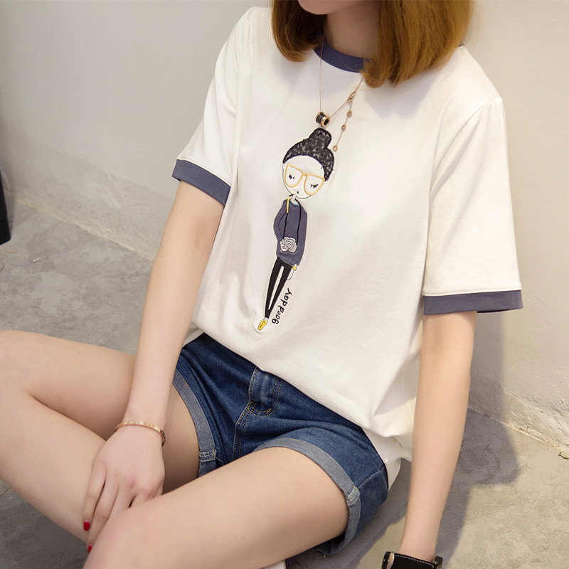 短袖t恤女寬松拼色小清新上衣女夏裝白色體恤衫韓版百搭新款