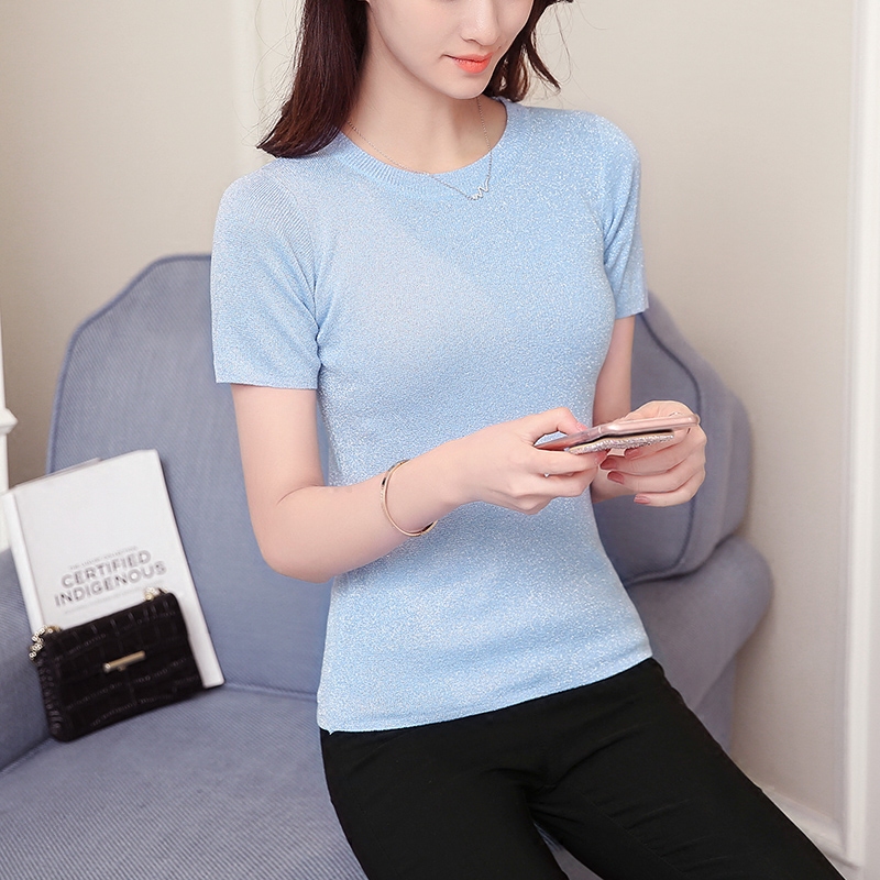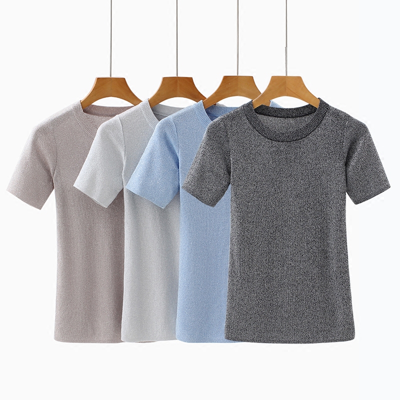 亮絲打底衫女短袖薄款修身上衣女新款韓版百搭針織t恤女夏季