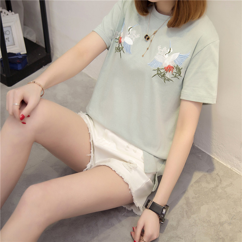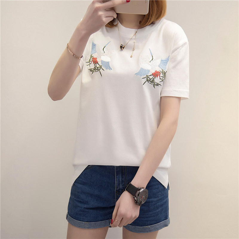 春季新款女裝上衣刺繡白色t恤女短袖寬松韓版打底體恤衫女潮