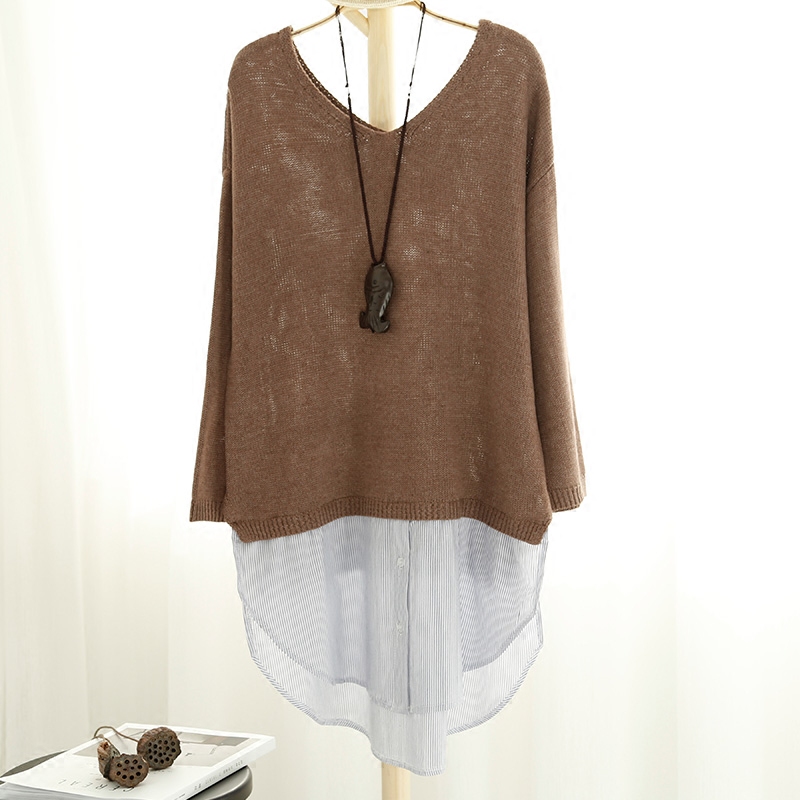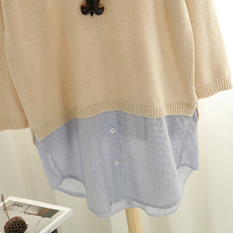 韓版套頭毛衣女寬松純色假兩件針織衫v領長袖打底衫春裝新款