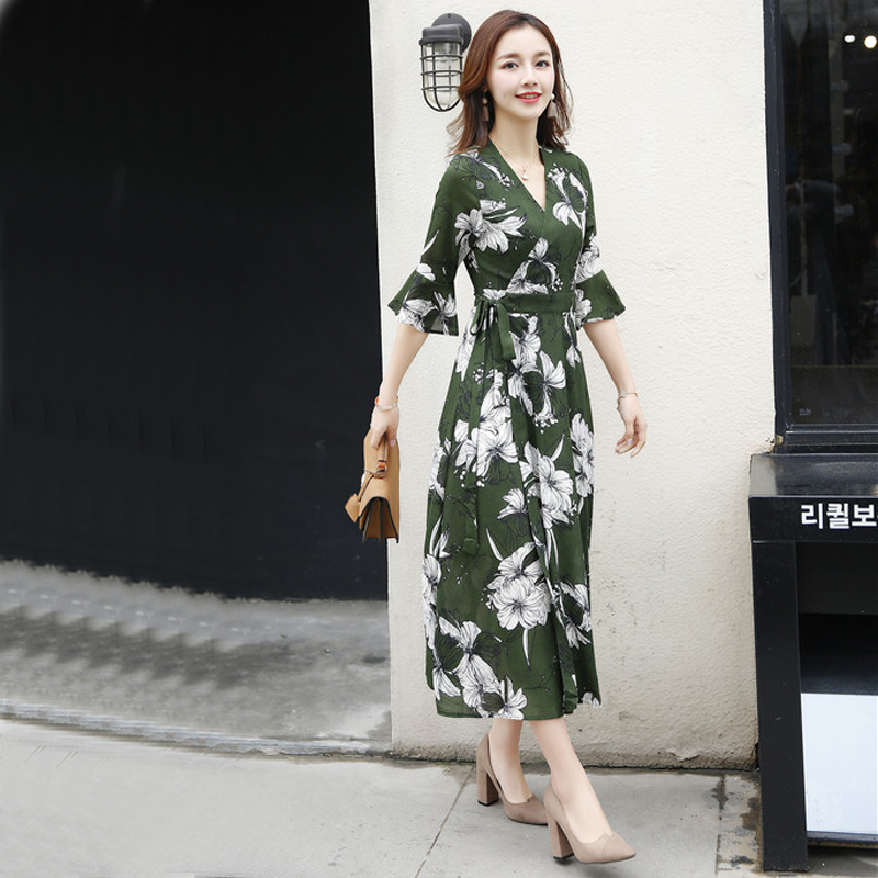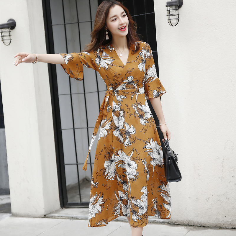 夏季波西米亞印花V領沙灘收腰雪紡連衣裙露肩過膝大擺長裙女