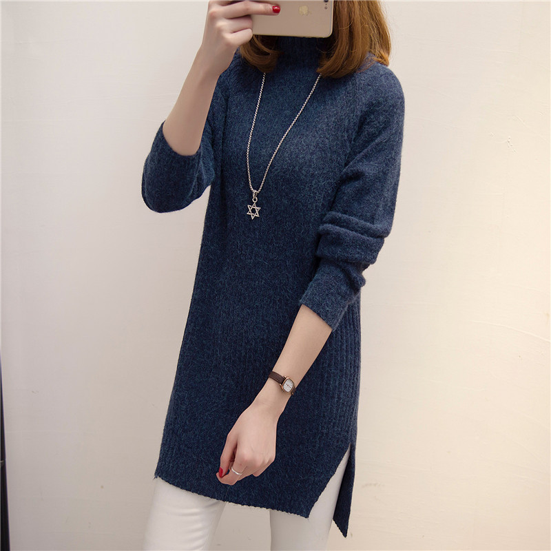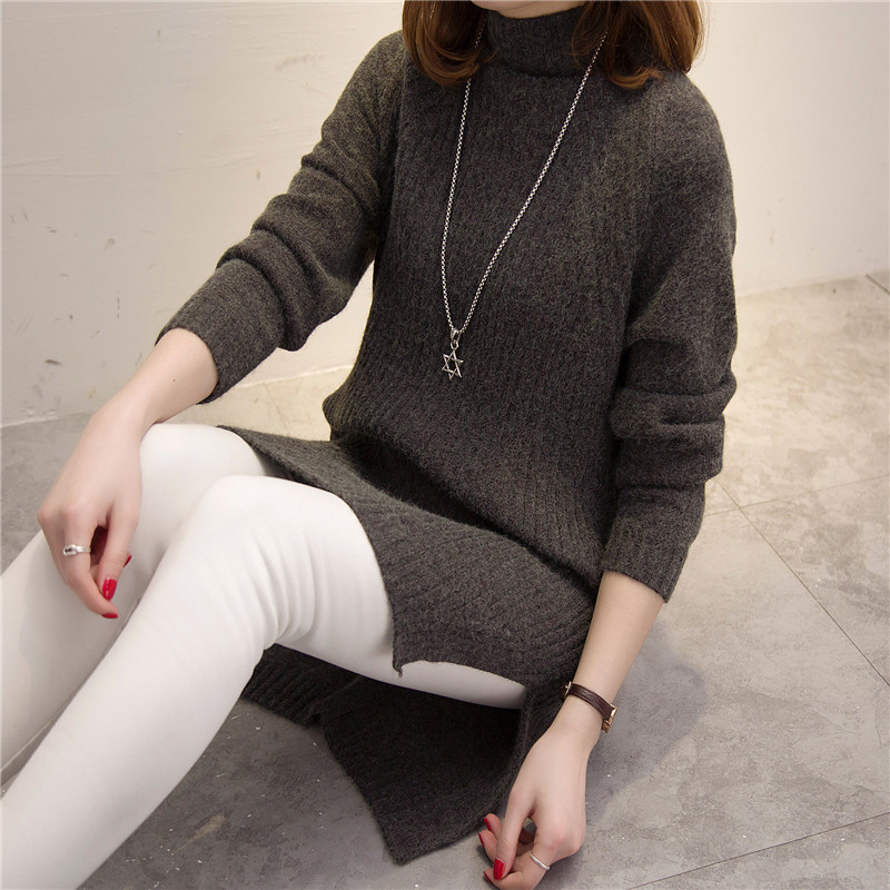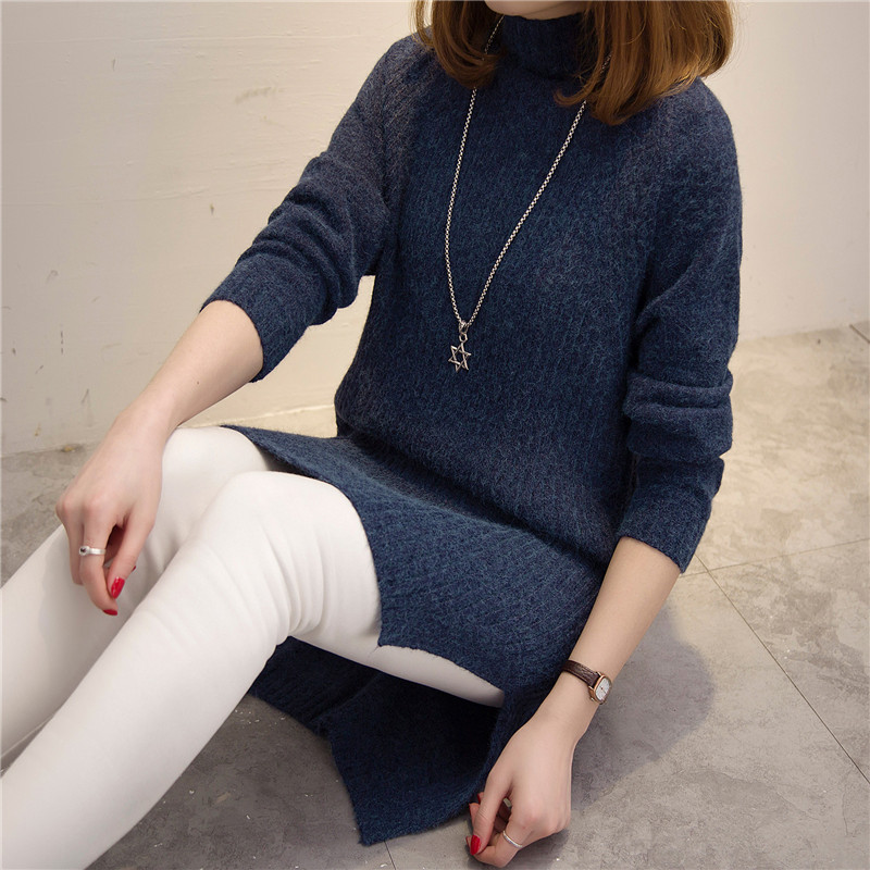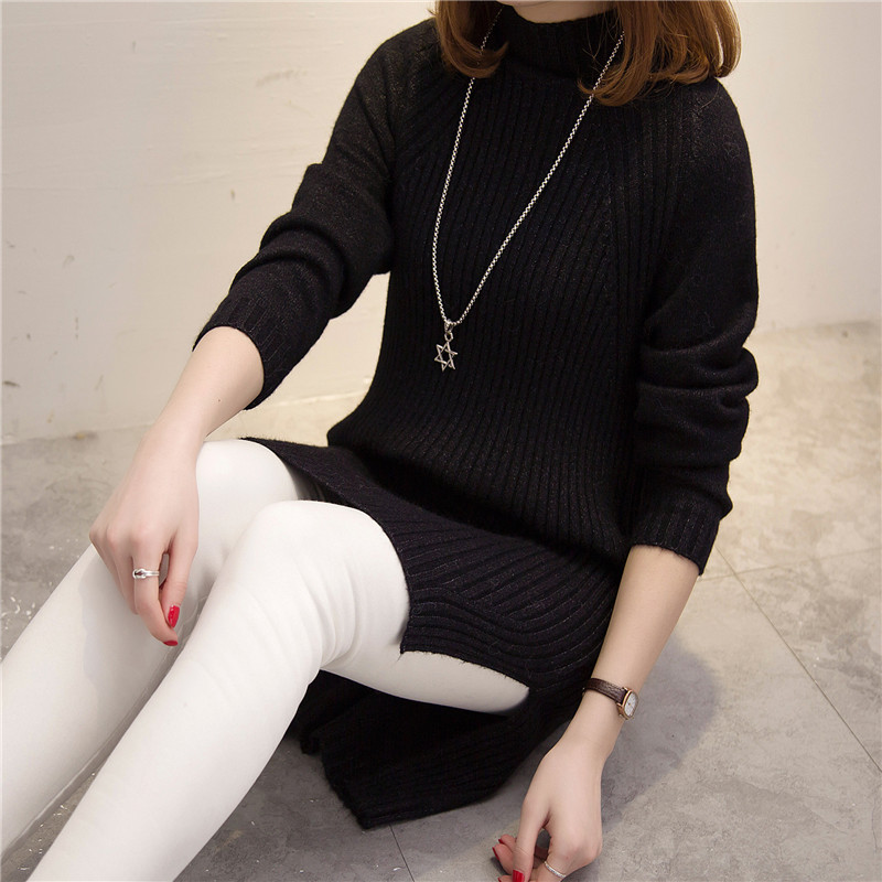 半高領冬季女裝中長款開叉韓版長袖毛衣女套頭純色加厚針織新款潮