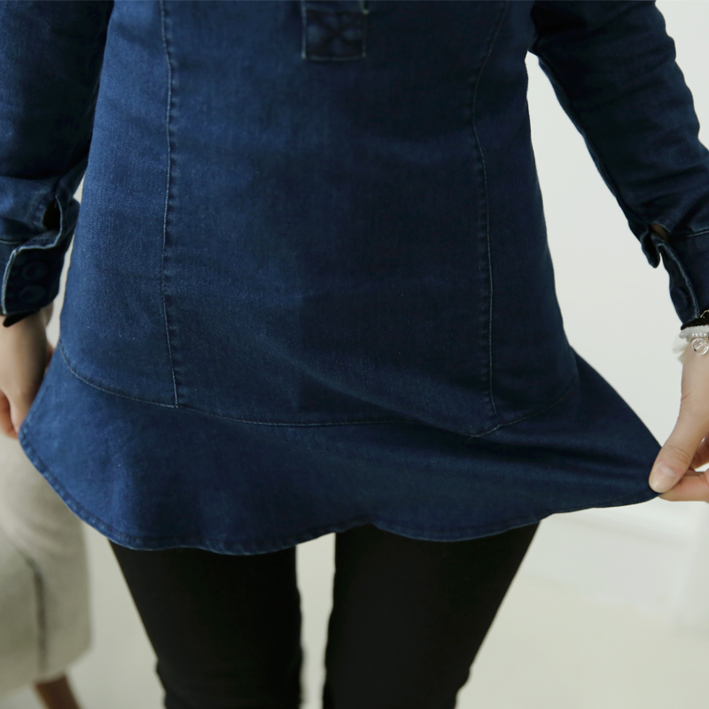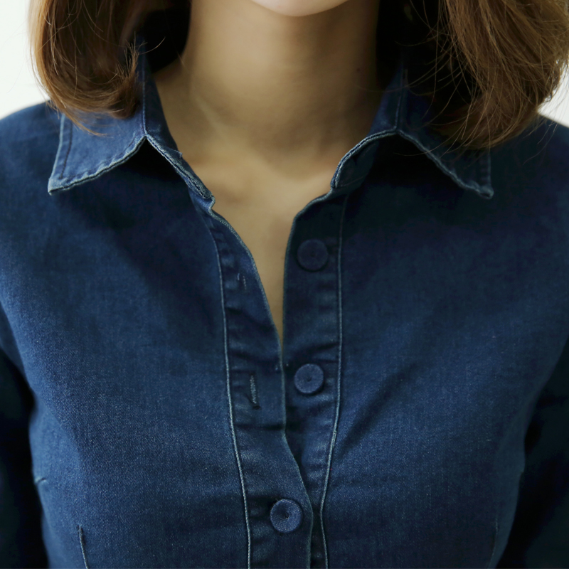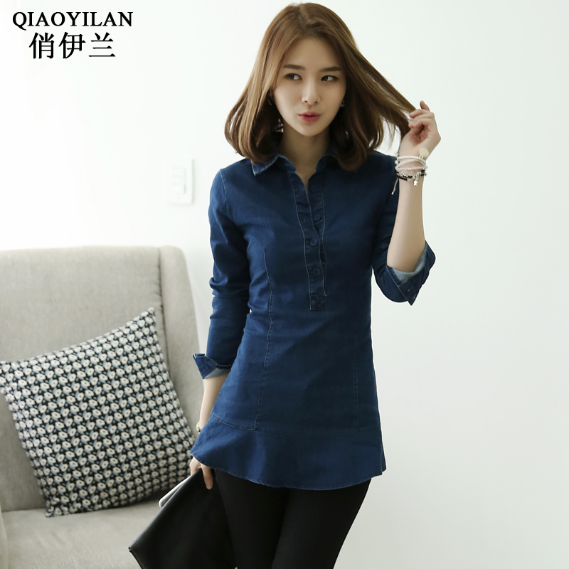 中長款牛仔襯衫女修身春裝新款韓版大碼彈力顯瘦長袖休閑上衣潮