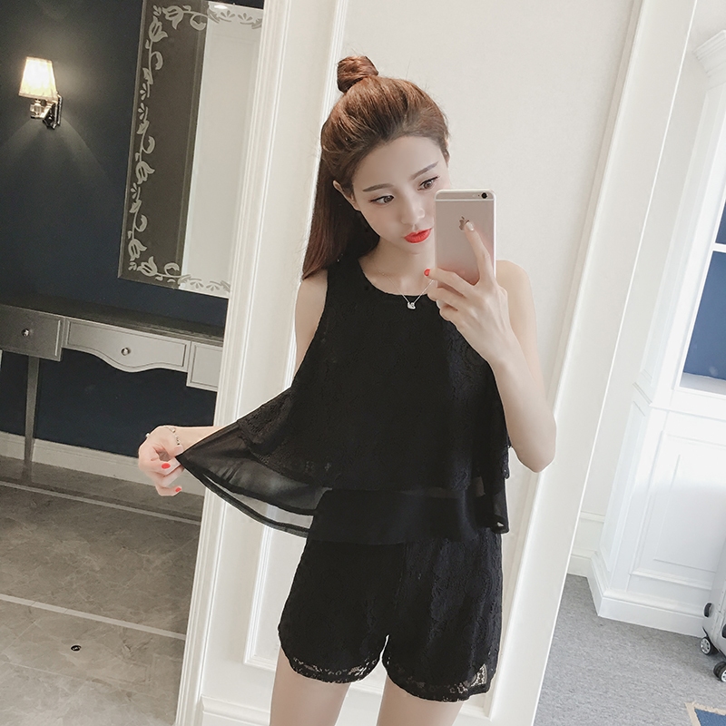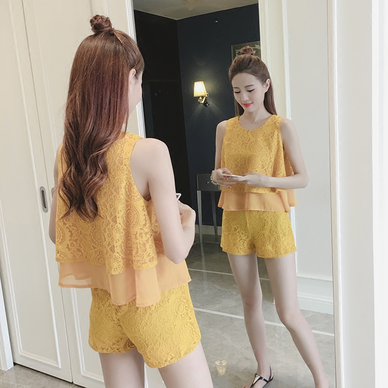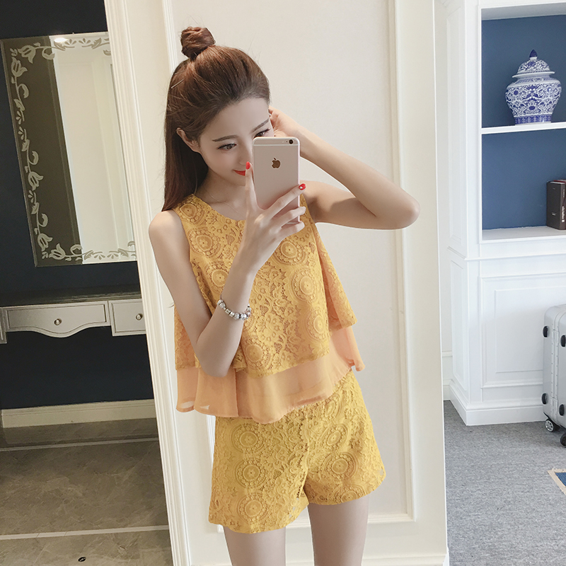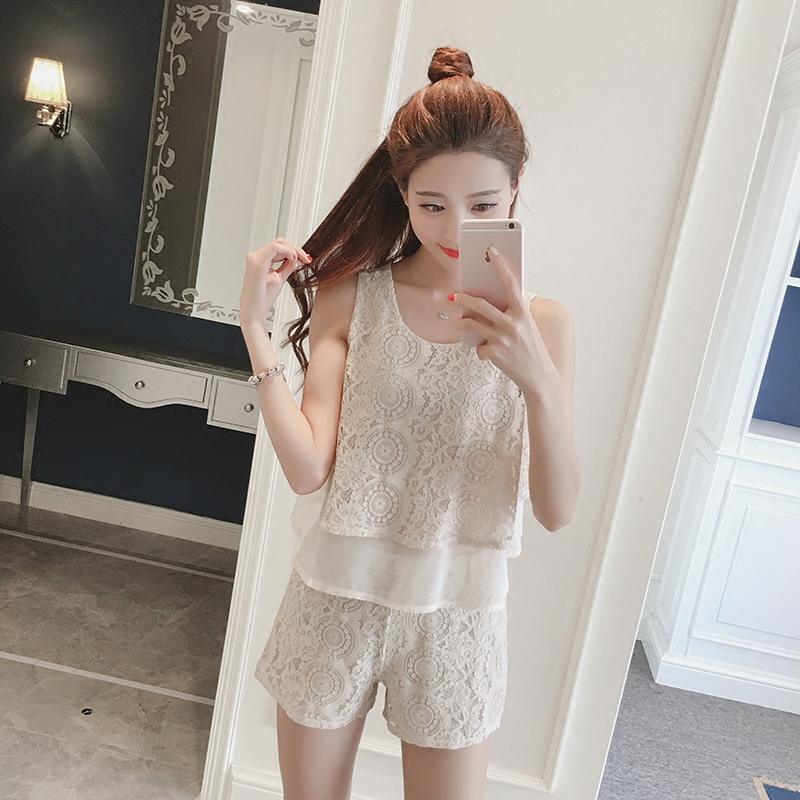夏季新款韓版名媛氣質拼接無袖上衣兩件套女休閑短褲蕾絲套裝