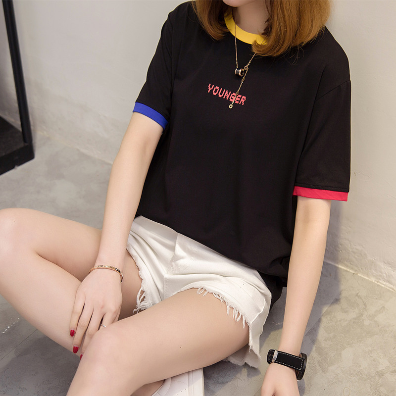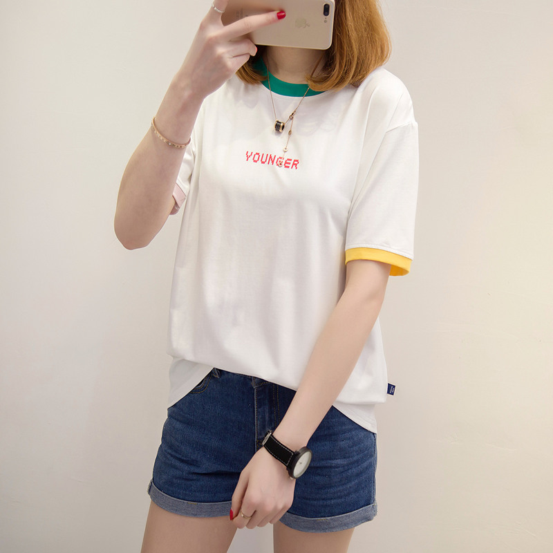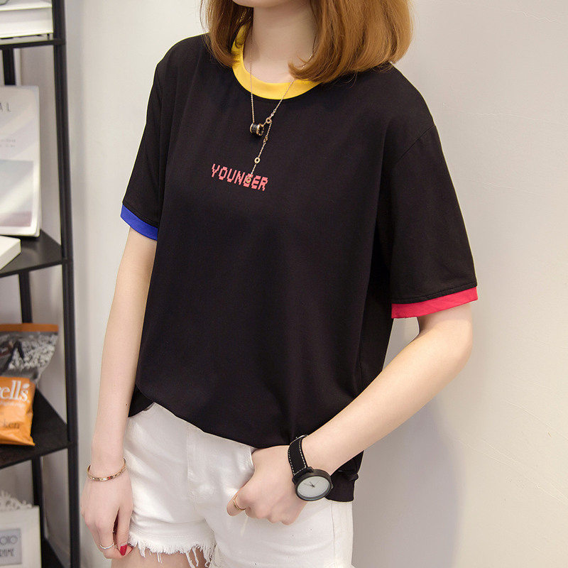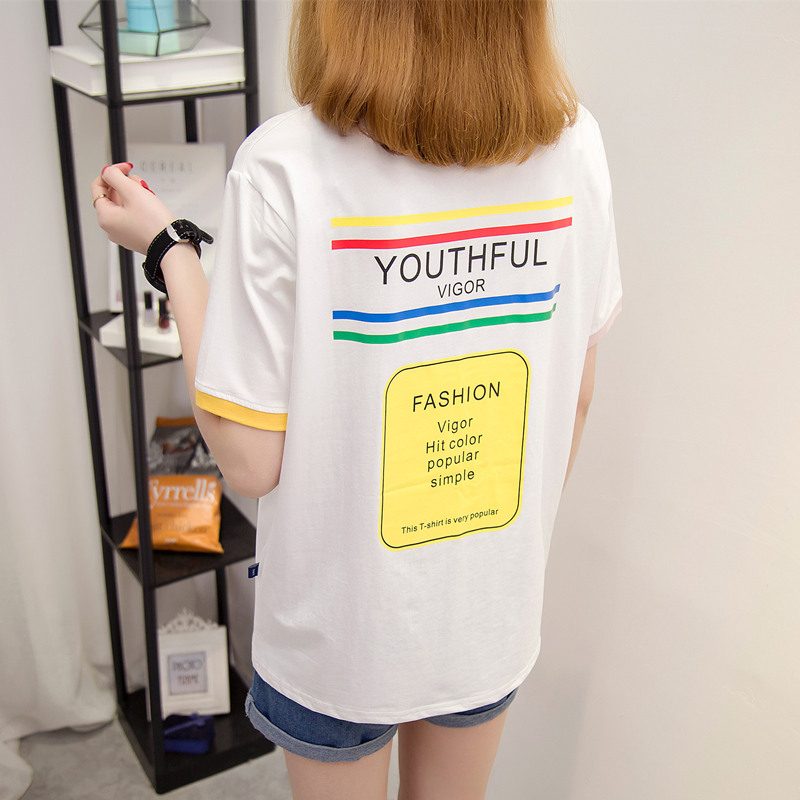 女裝夏裝新款潮寬松白色t恤女上衣短袖體恤衫字母拼色百搭潮