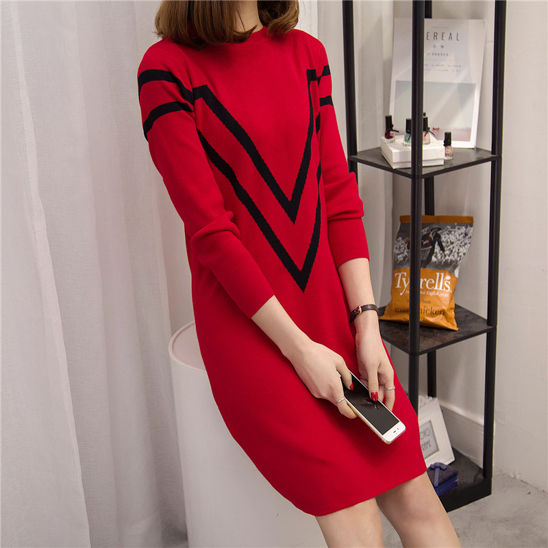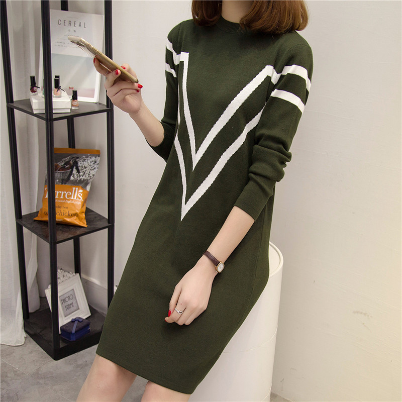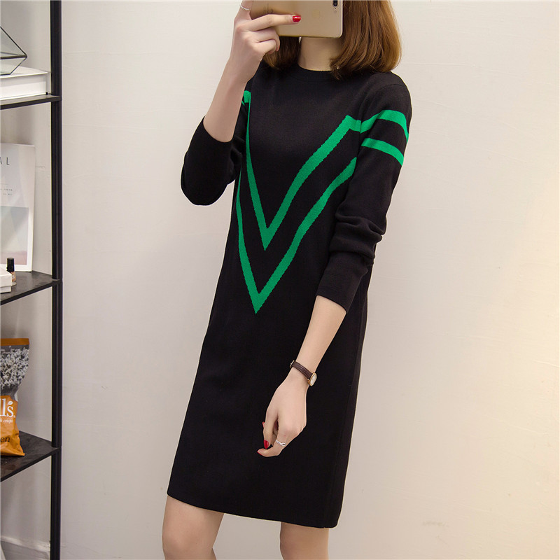 條紋針織衫套頭毛衣女秋冬季女裝連衣裙中長款長袖寬松新款潮