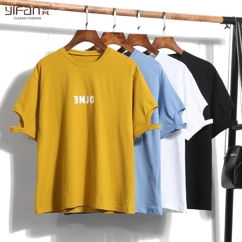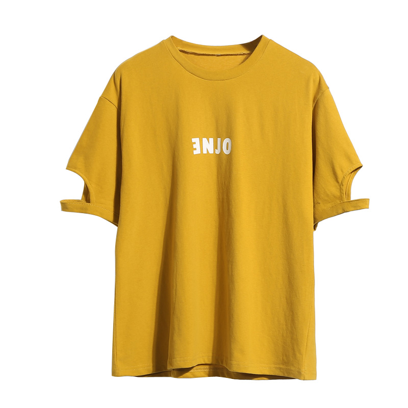 夏季純色字母印花寬松T恤韓版破洞短袖上衣女裝純棉打底體恤
