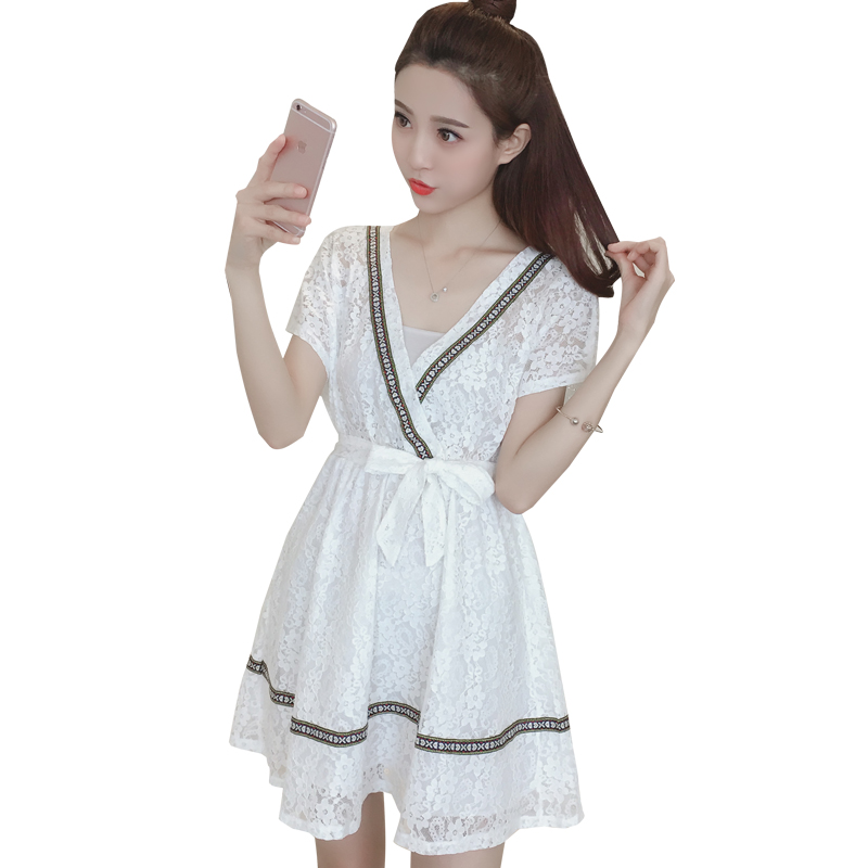 夏季新款女裝韓版V領收腰白色裙子修身中長款短袖蕾絲連衣裙