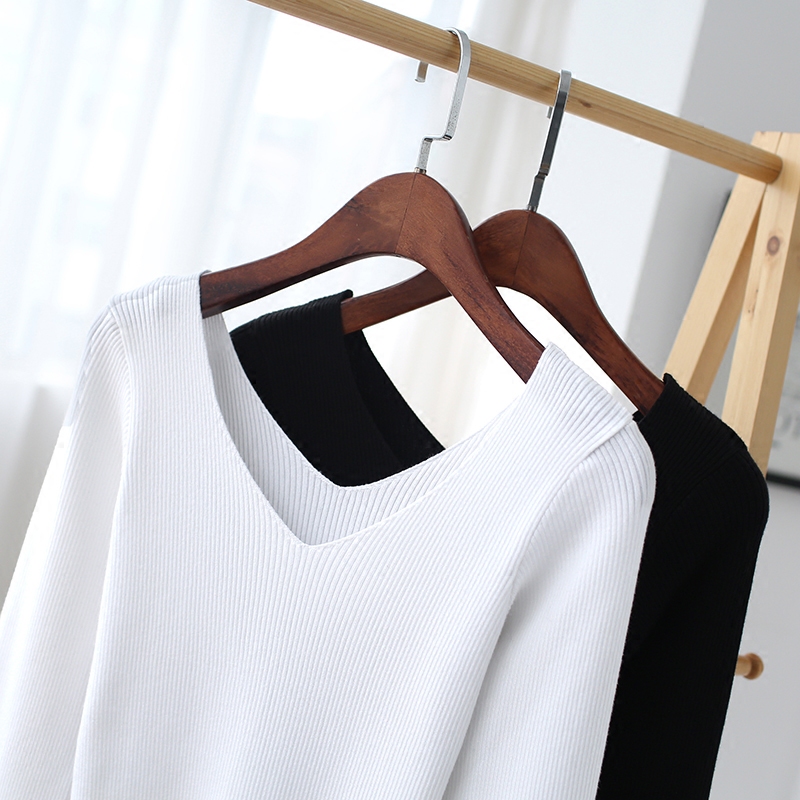 白色V領短款針織衫女修身長袖毛衣女春季新款針織打底衫毛衣