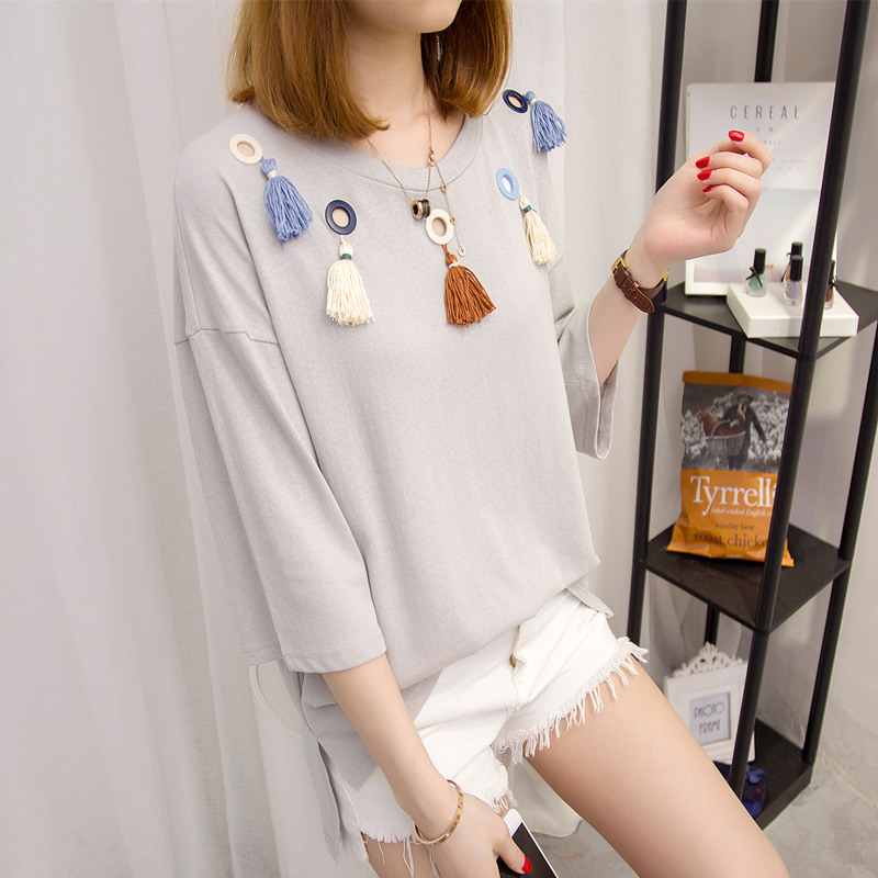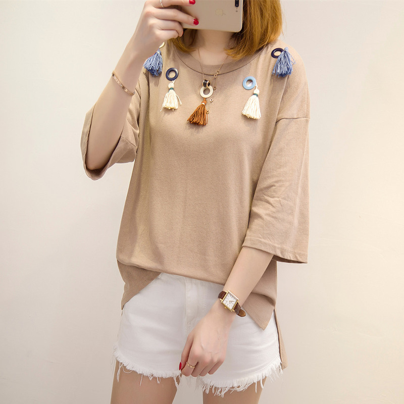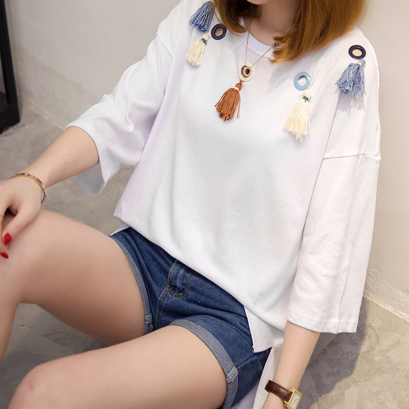 短袖上衣女夏新款寬松t恤女中長袖韓版鏤空流蘇打底體恤百搭