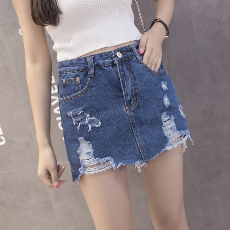 破洞牛仔裙半身裙女夏高腰A字裙包臀短裙防走光褲裙磨破半裙