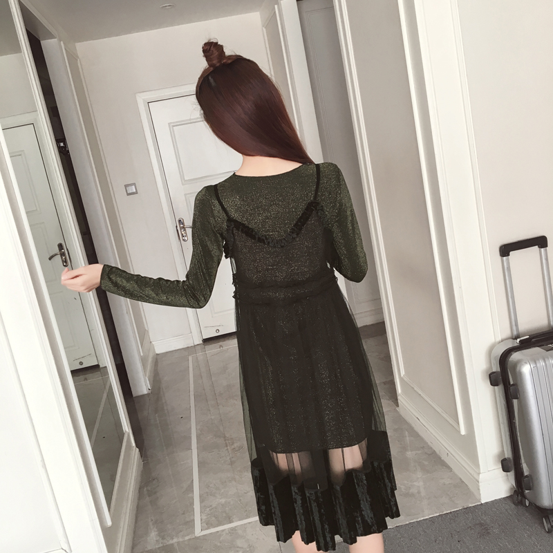 春裝新款女裝韓版網紗吊帶裙兩件套顯瘦中長款長袖打底連衣裙