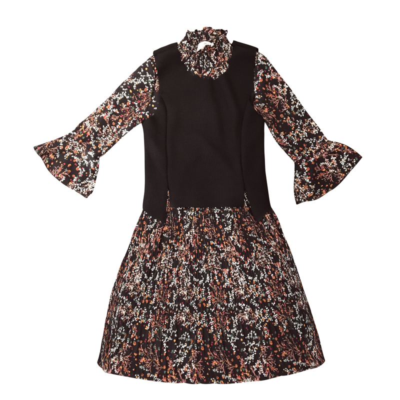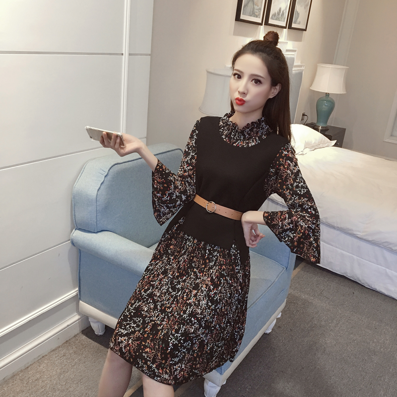 新款女裝韓版馬甲兩件套顯瘦中長款復古碎花雪紡長袖連衣裙春
