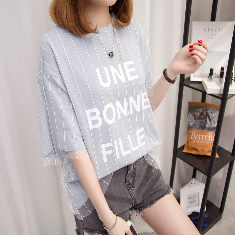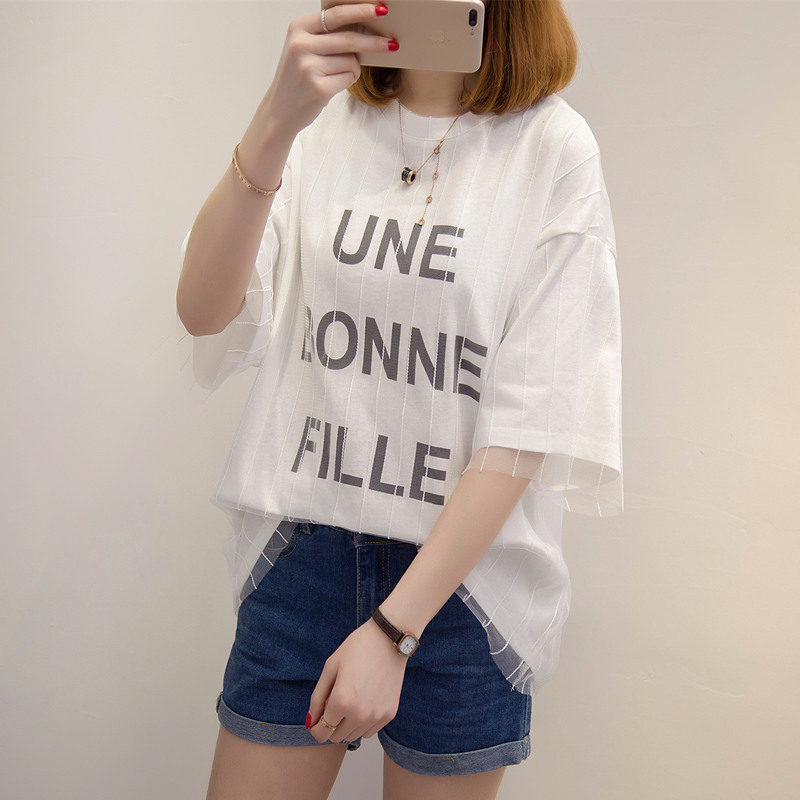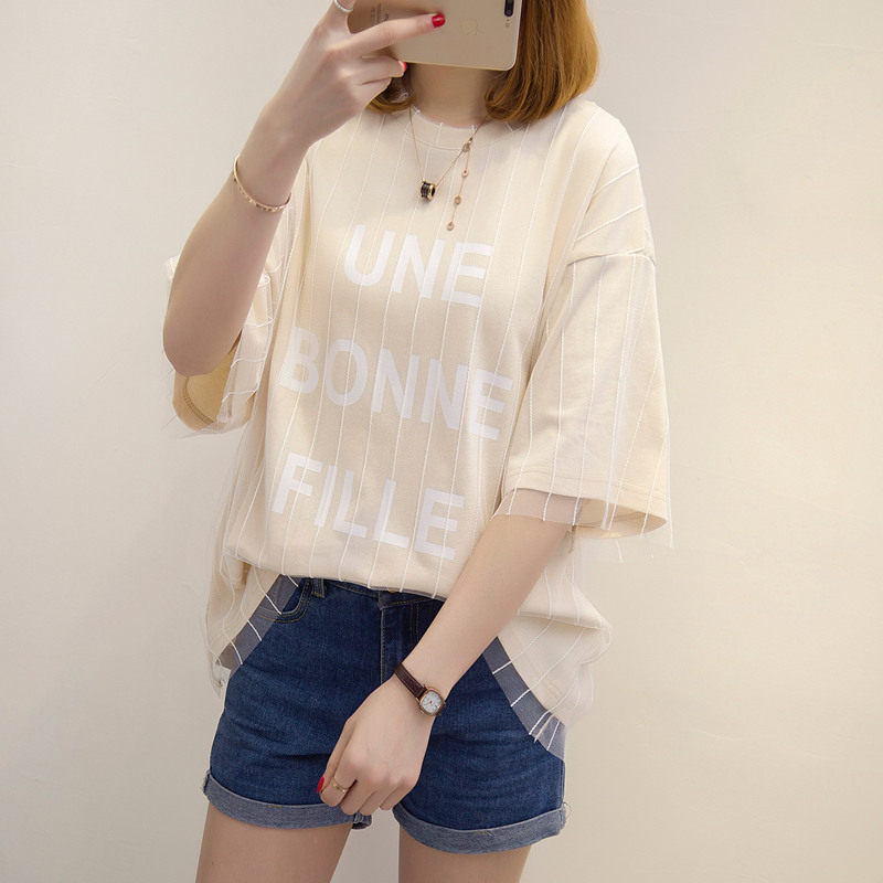 女裝春裝新款短袖t恤女防曬衣服女字母中長袖百搭體恤衫上衣