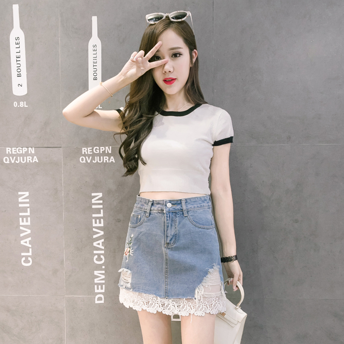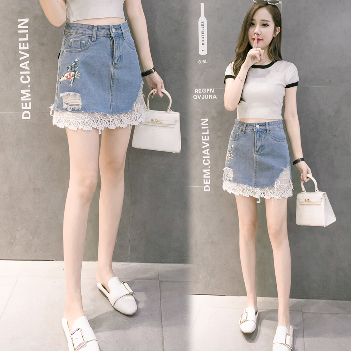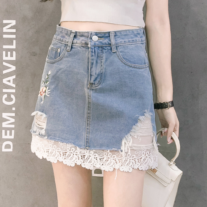 韓高腰破洞牛仔裙半身裙女刺繡A字裙包臀短裙繡花蕾絲拼接半裙夏