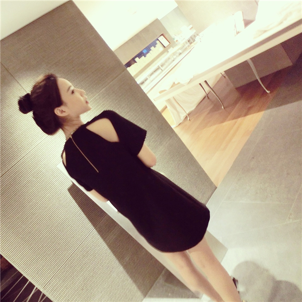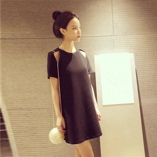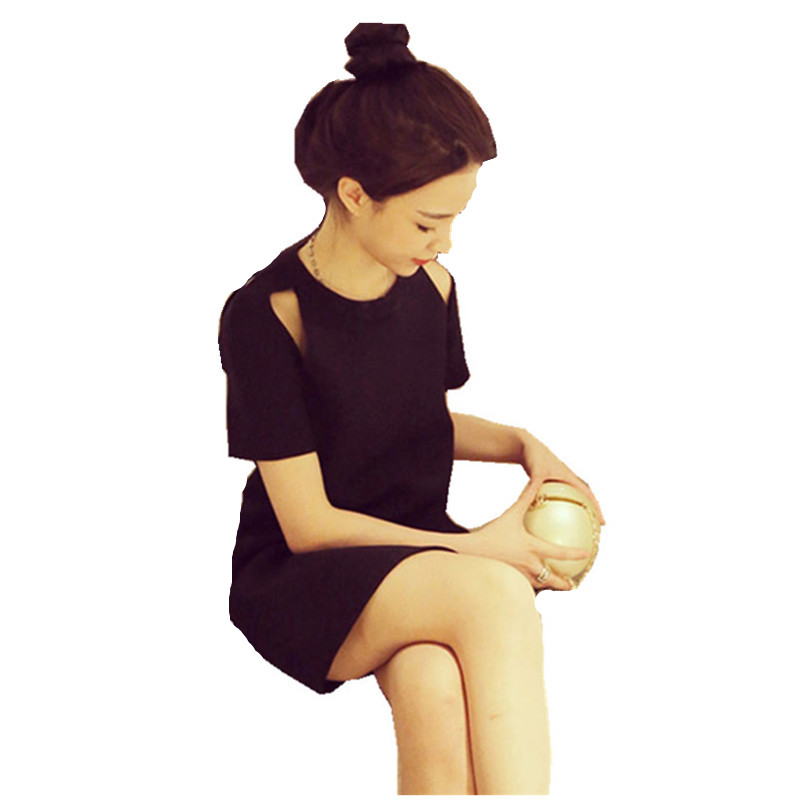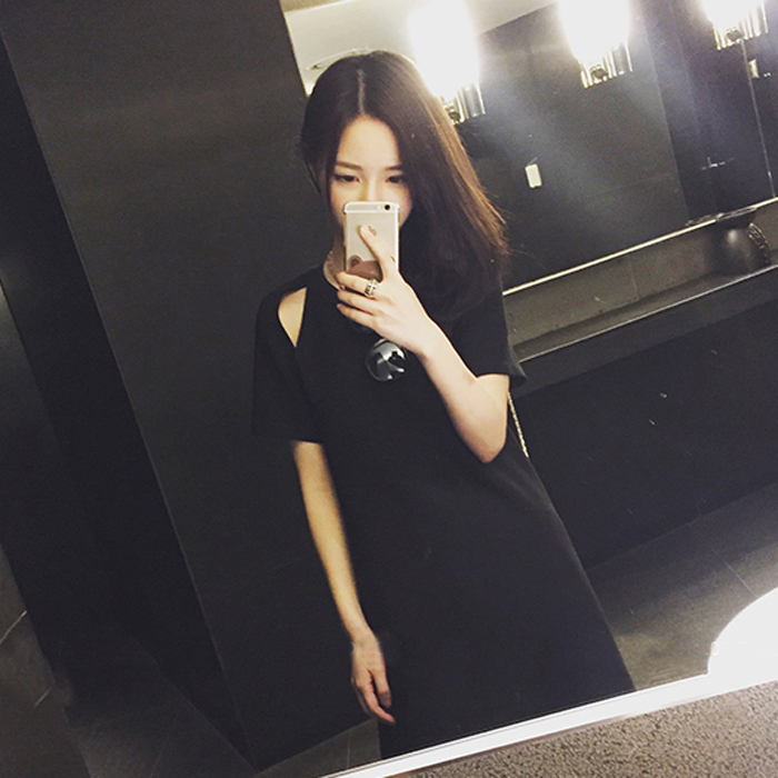 夏季新款韓版大碼女裝寬松直筒小黑裙百搭顯瘦露肩短袖連衣裙