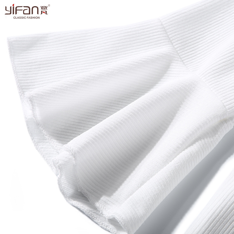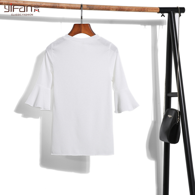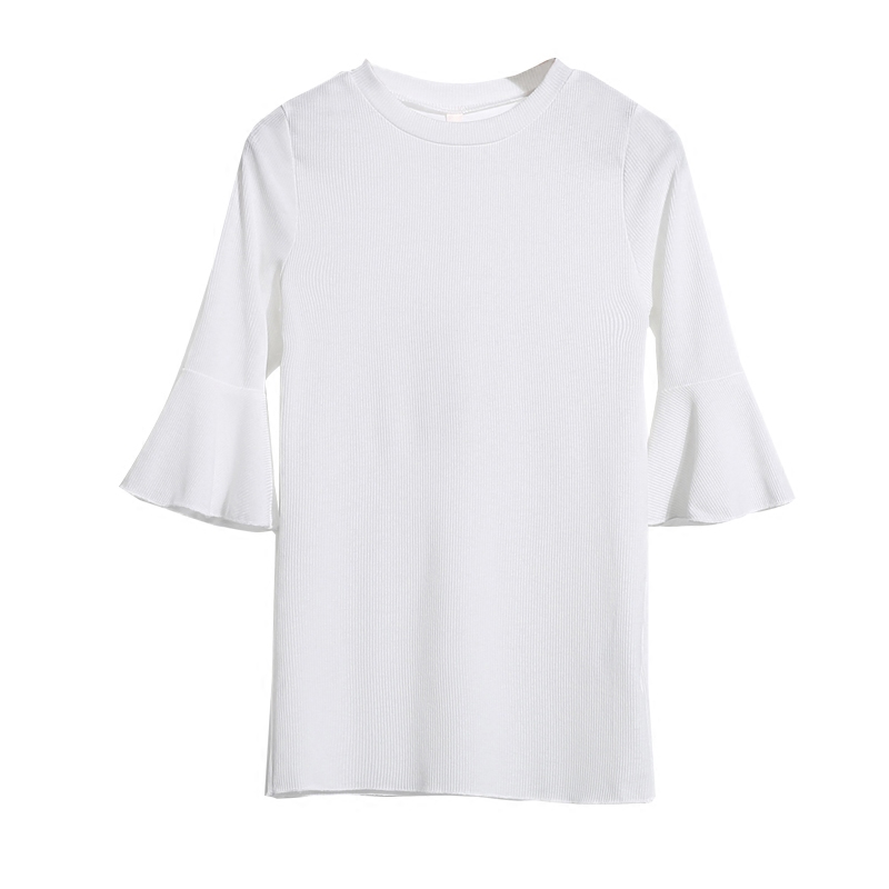夏季七分袖女T恤喇叭袖上衣修身短款白色圓領打底衫韓版荷葉邊