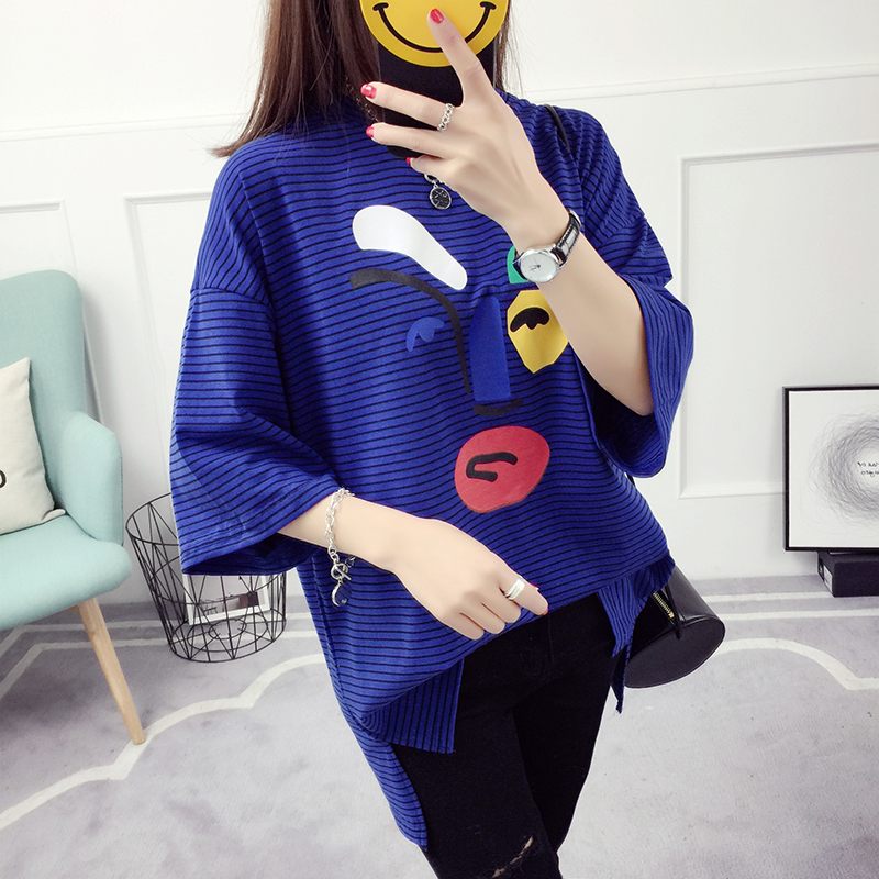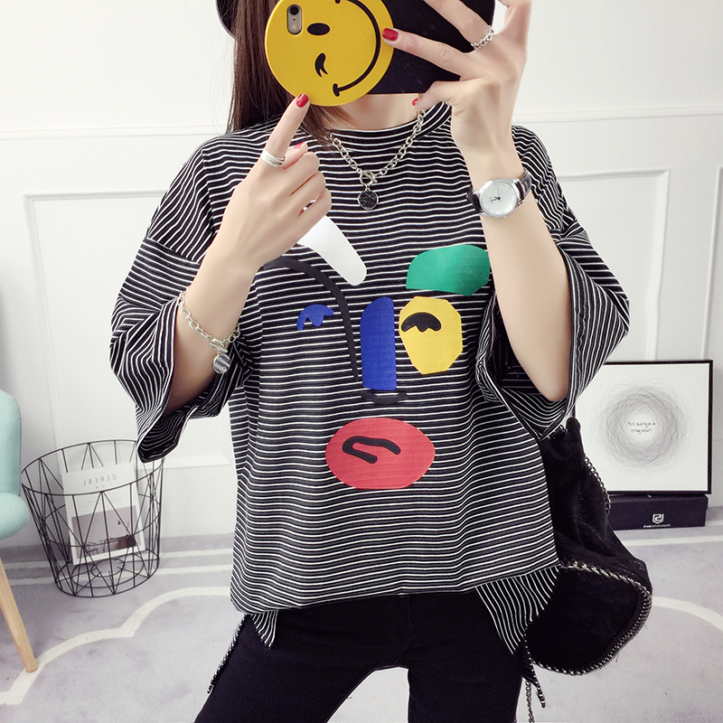 條紋t恤衣服女夏季春裝新款潮學生韓版寬松中長款打底衫短袖