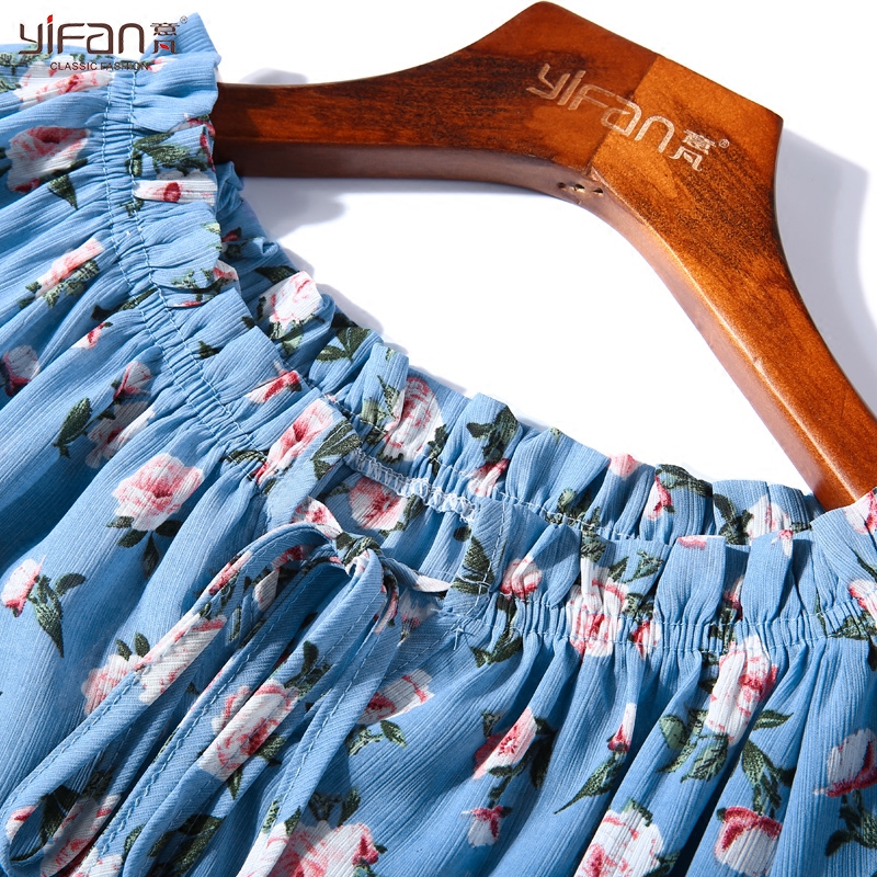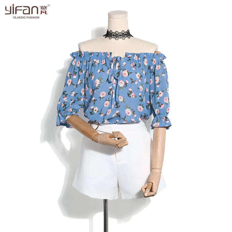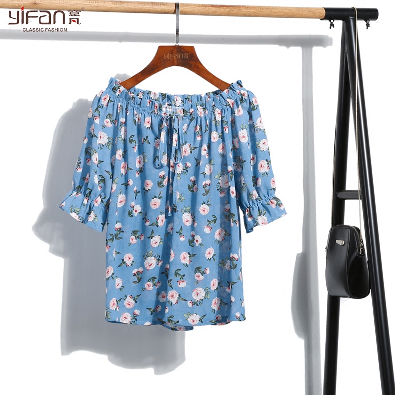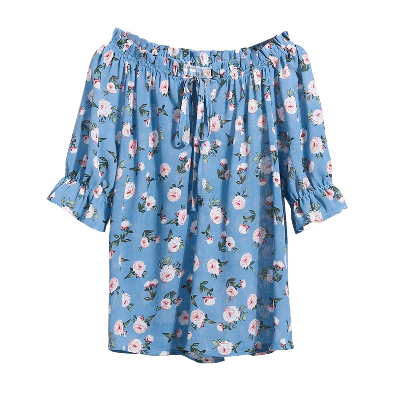 韓版甜美碎花喇叭袖寬松雪紡衫夏一字領露肩短袖娃娃衫印花上衣女