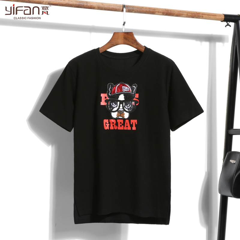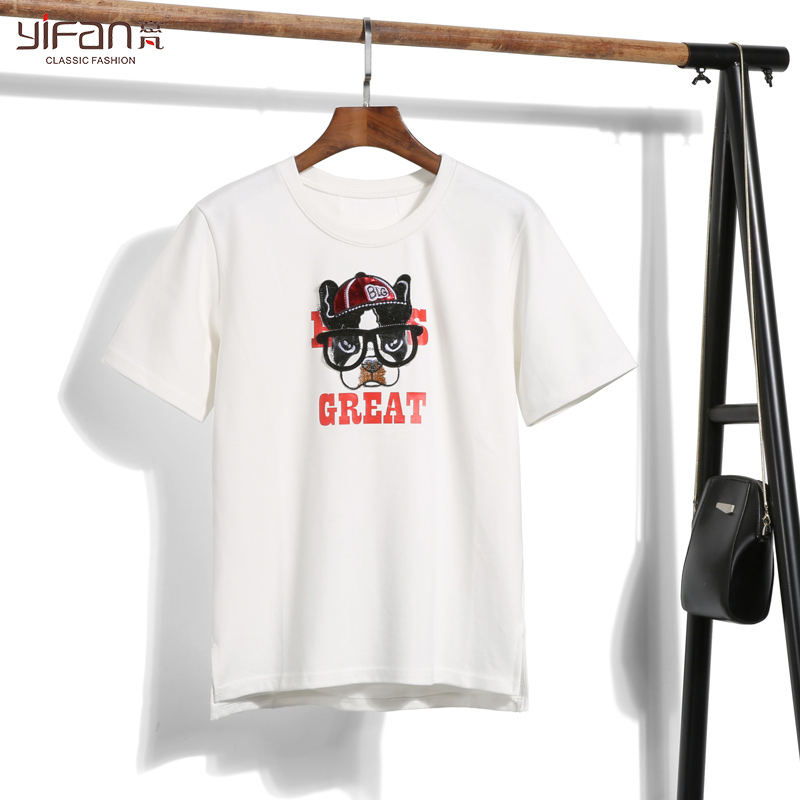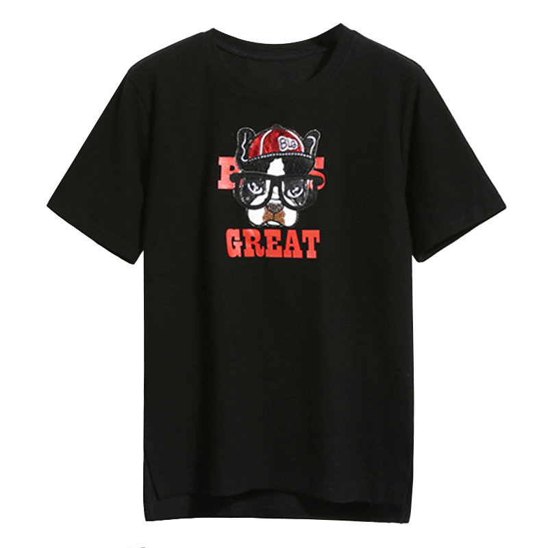 春夏新款卡通狗貼布套頭短袖T恤寬松純色簡約女裝百搭學生裝