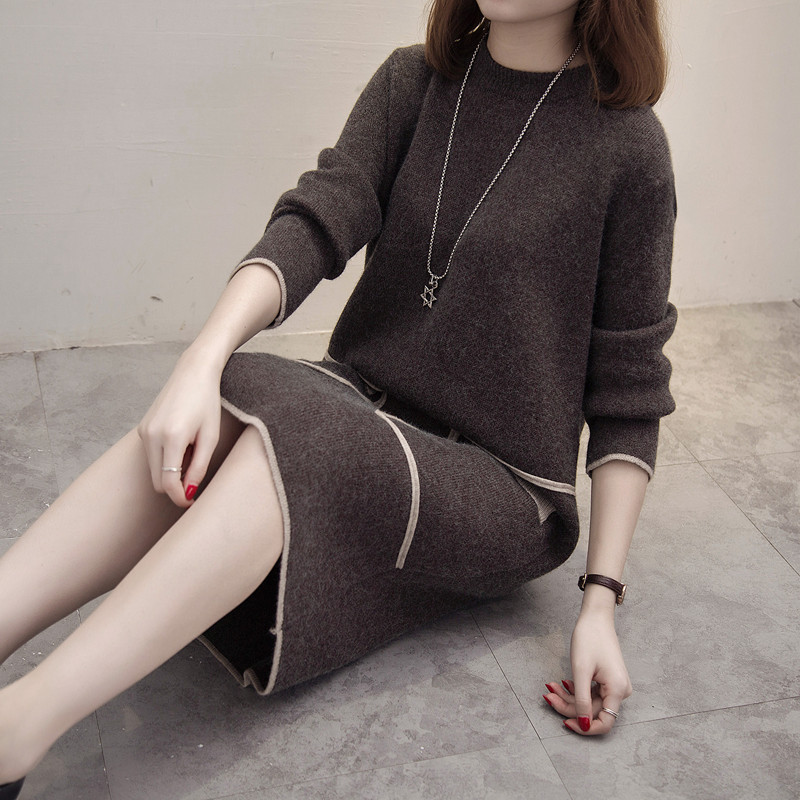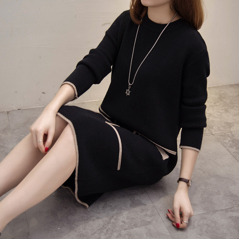 圓領套頭毛衣女秋冬季針織衫寬松口袋打底衫加厚中長款毛衣裙外套