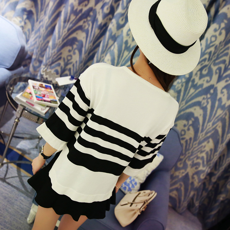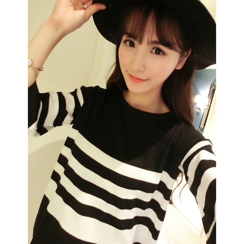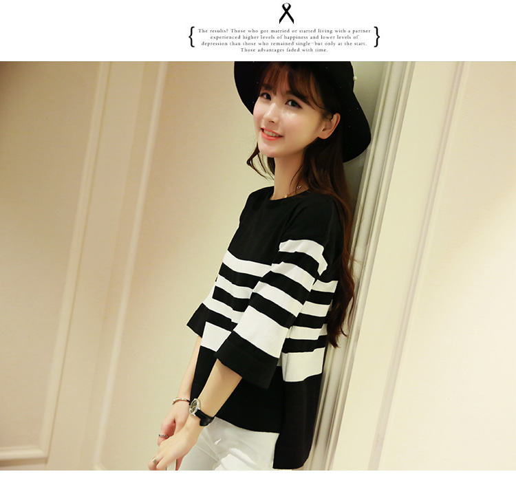 春夏新款韓版條紋七分袖寬松顯瘦打底衫女裝套頭針織衫上衣潮