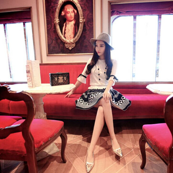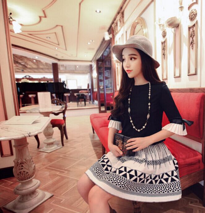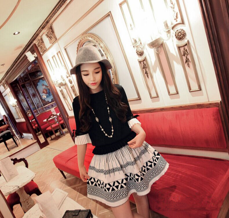 秋裝新款女裝韓版兩件套針織連衣裙女顯瘦七分袖印花套裝裙子