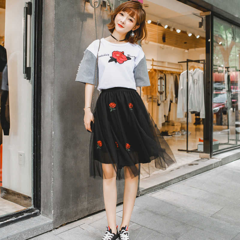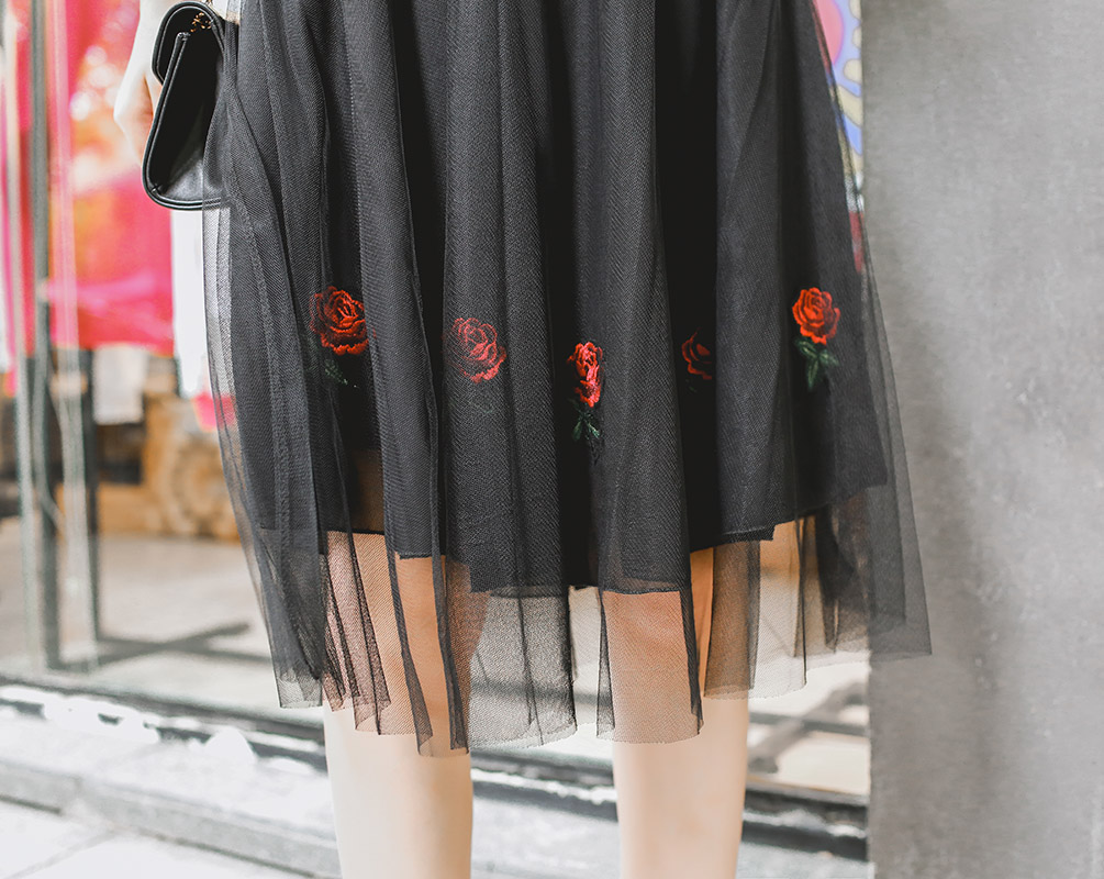 夏季網紗半身裙中長款百褶裙繡花蓬蓬裙a字裙中長裙紗裙中裙
