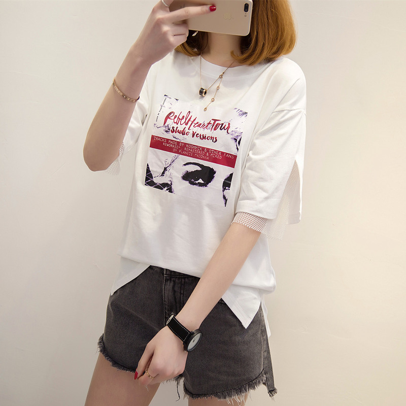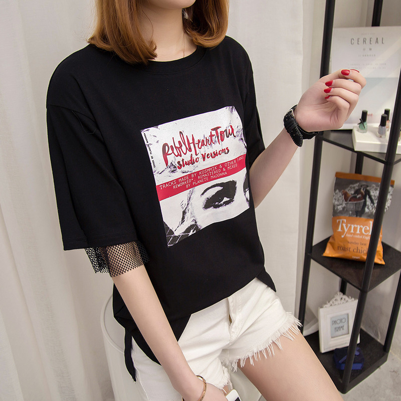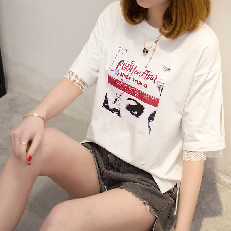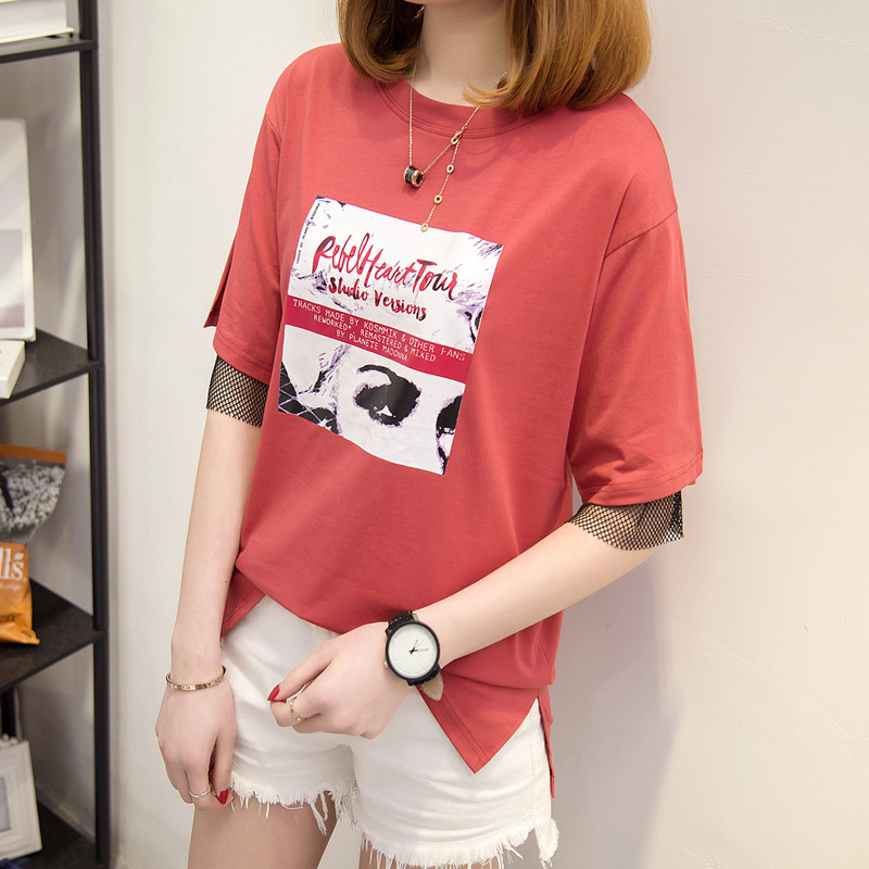 女裝夏裝新款潮寬松t恤女短袖網紗假兩件韓版學生中長袖百搭