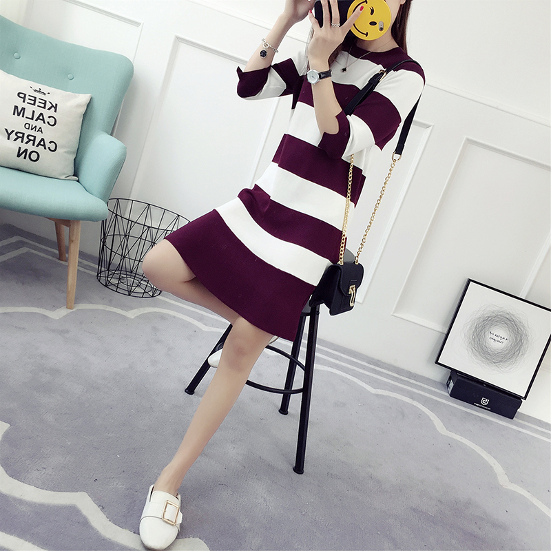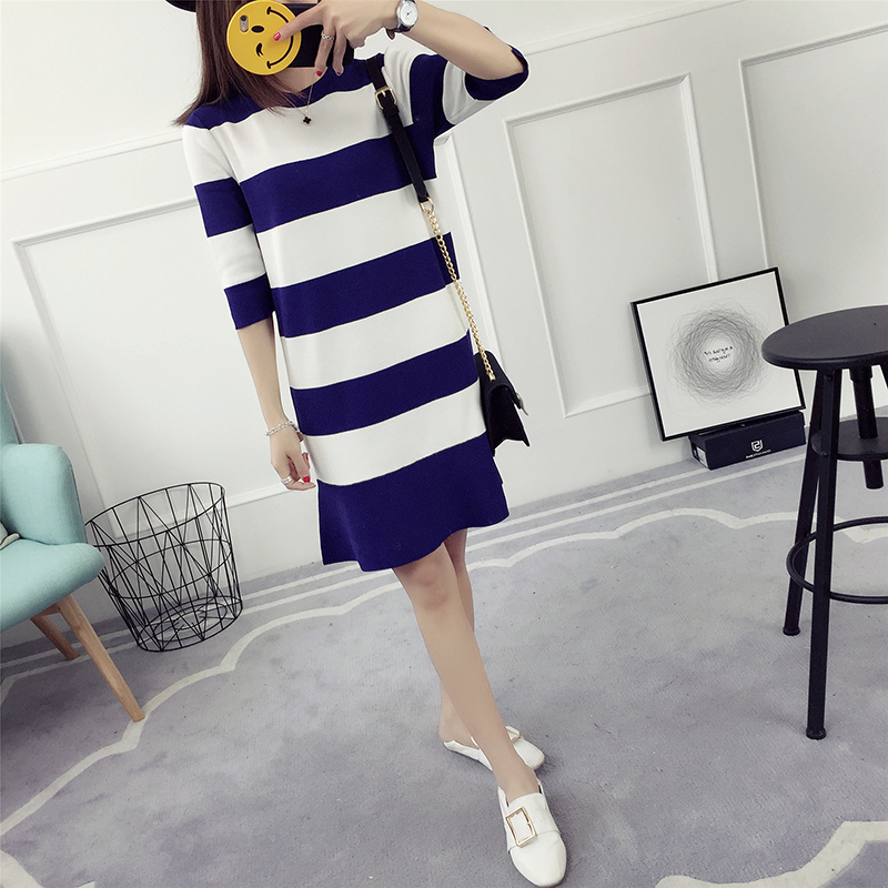 條紋針織連衣裙女春秋新款韓版顯瘦中長款打底魚尾裙春季百搭