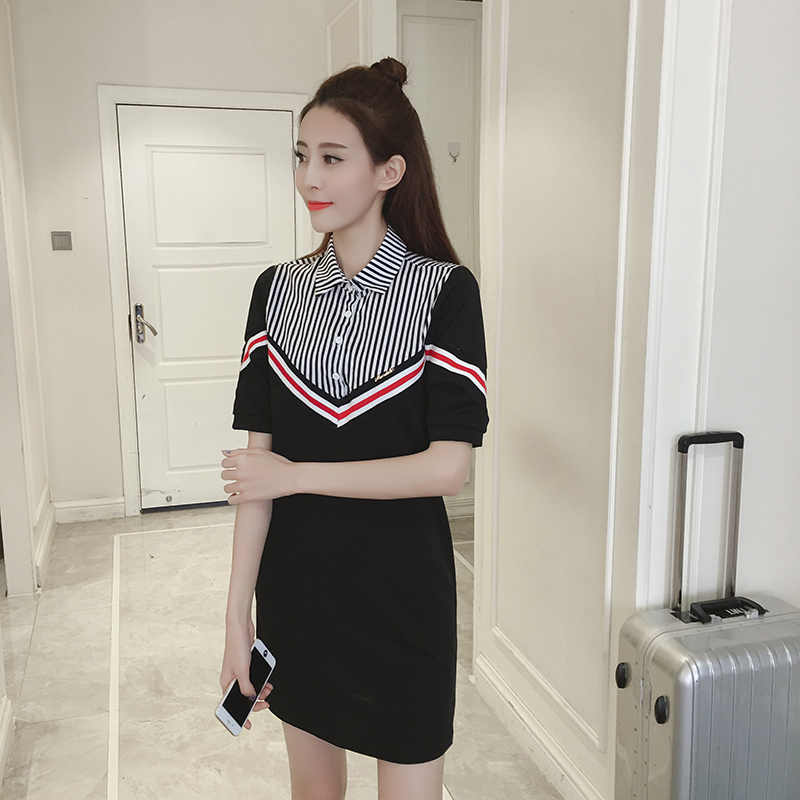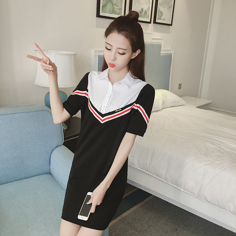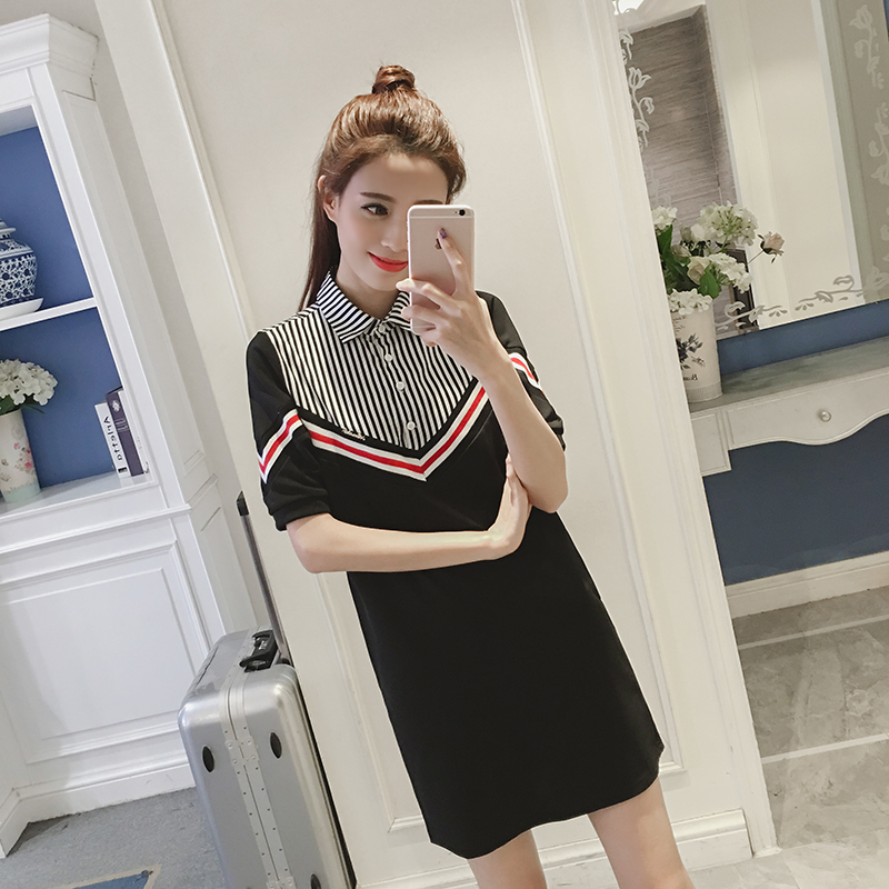 夏季新款女裝韓版假兩件撞色條紋顯瘦中長款短袖襯衫連衣裙潮