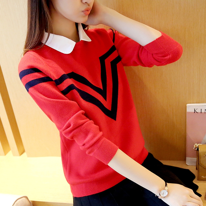 秋季女裝套裝潮假兩件上衣條紋針織衫女套頭毛衣秋冬新款百搭打底