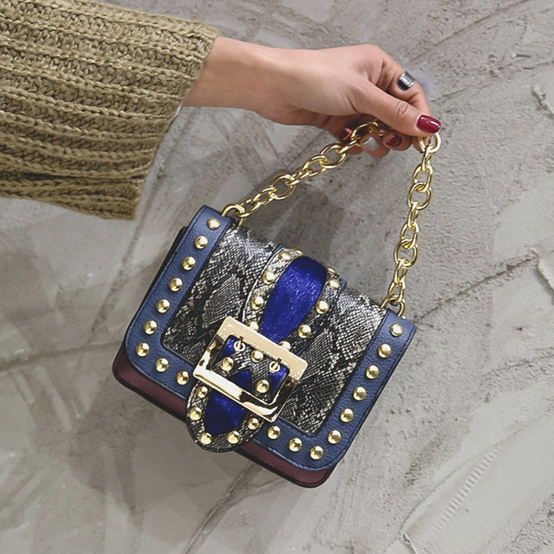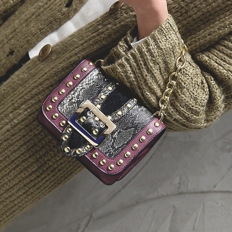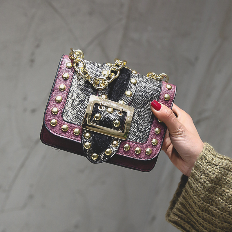 新款蛇皮紋鏈條斜挎包女包日韓版時尚迷你鉚釘單肩包包小包潮