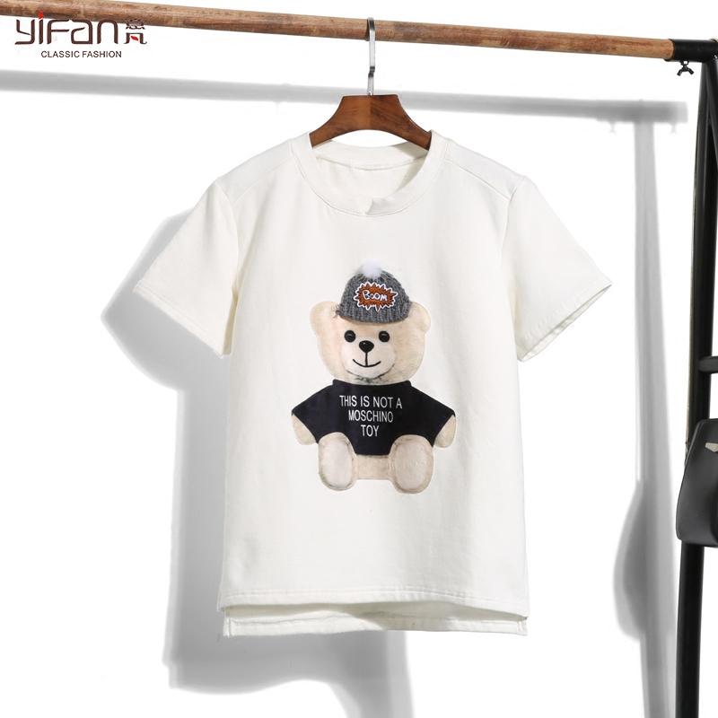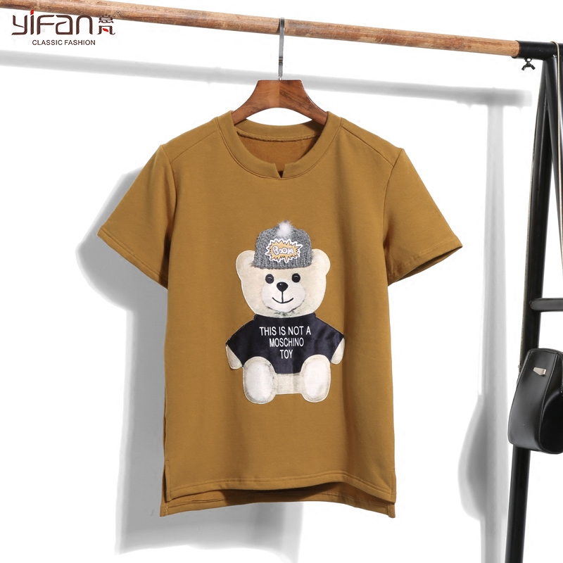 春裝新款卡通熊圓領套頭短袖T恤女裝韓版大碼純色打底衫