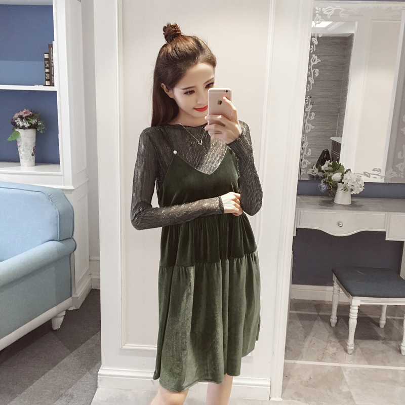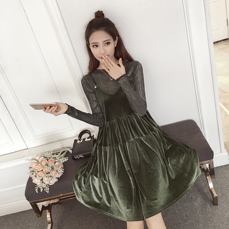 春裝新款女裝韓版絲絨吊帶裙兩件套顯瘦長袖打底連衣裙套裝潮
