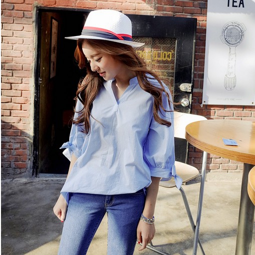 2017春夏新款條紋襯衣V領短袖中長款寬松大碼女裝學生襯衫女韓范