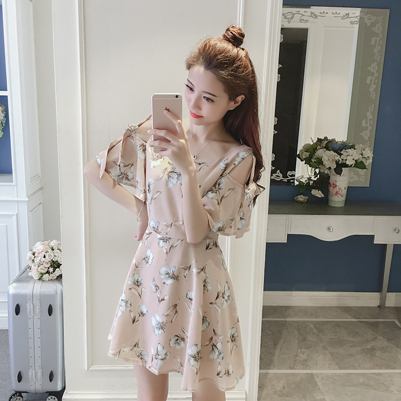 夏季新款女裝韓版荷葉袖短袖a字裙子修身碎花露肩雪紡連衣裙