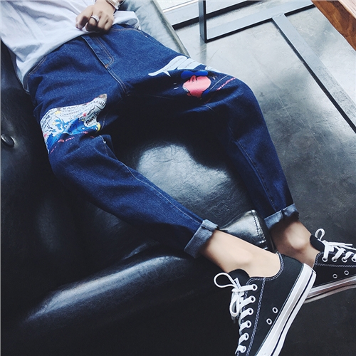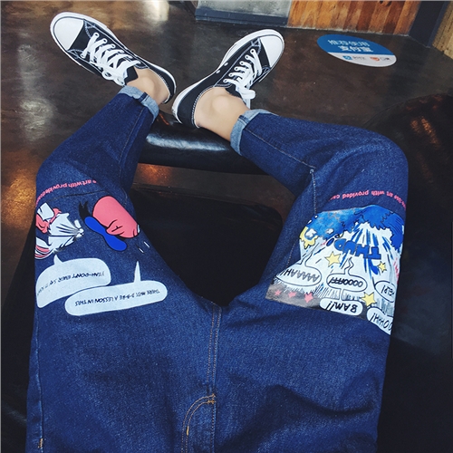 秋天港風秋冬小腳褲長褲子嘻哈褲潮男卡通印花牛仔褲