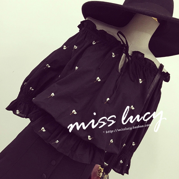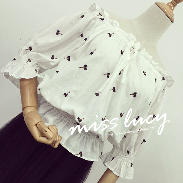 夏裝新款韓國寬松刺繡木耳邊系帶一字肩套頭短款雪紡衫上衣女